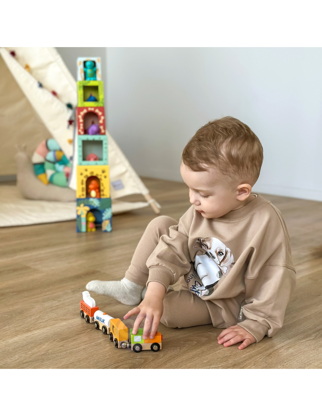 - - komplet może być wykorzystany jako samodzielna zabawka, ale możemy go użyć również do uzupełnienia kolejki, innego kompletu klocków, czy drewnianej farmy,