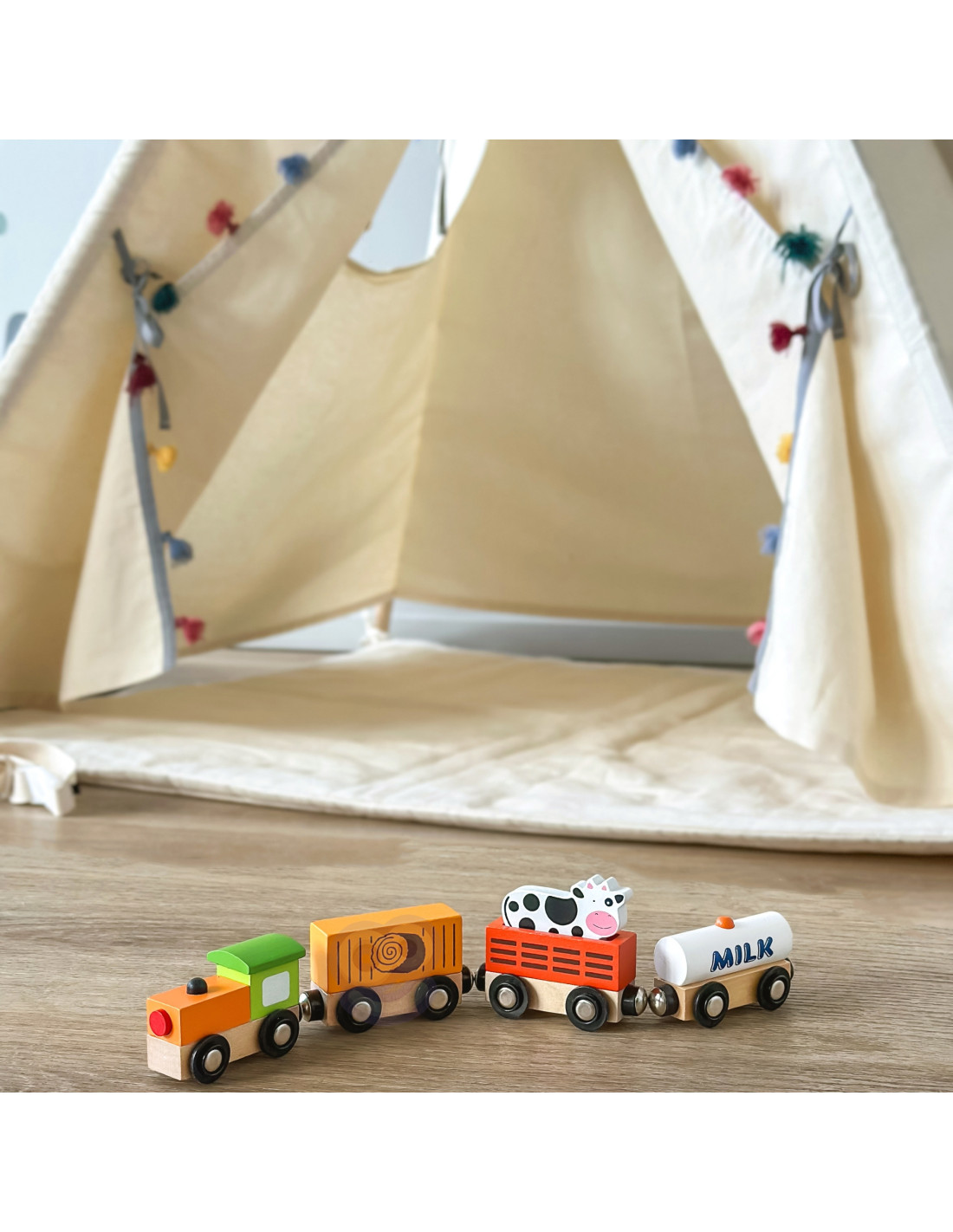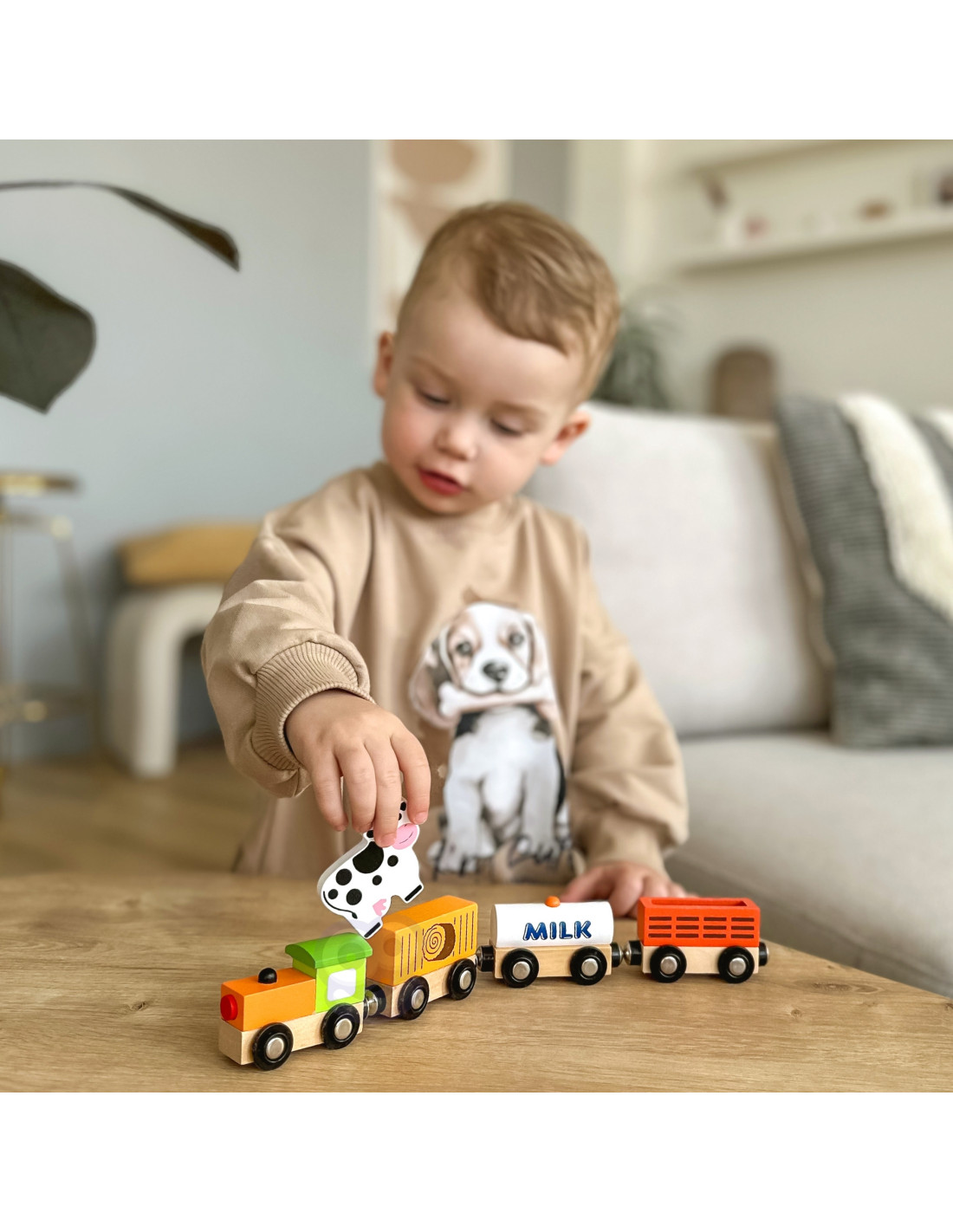 Drewniana figurka pociągu z wagonami wypełnionymi ładunkiem związanymi z farmą. Składa się z 4 elementów, które łączą się ze sobą magnesami. Zaprojektowana została przez cenionego producenta zabawek drewnianych firmę Viga Toys dla dzieci od 3 roku życia, doskonała do przedszkola jak i do domu.