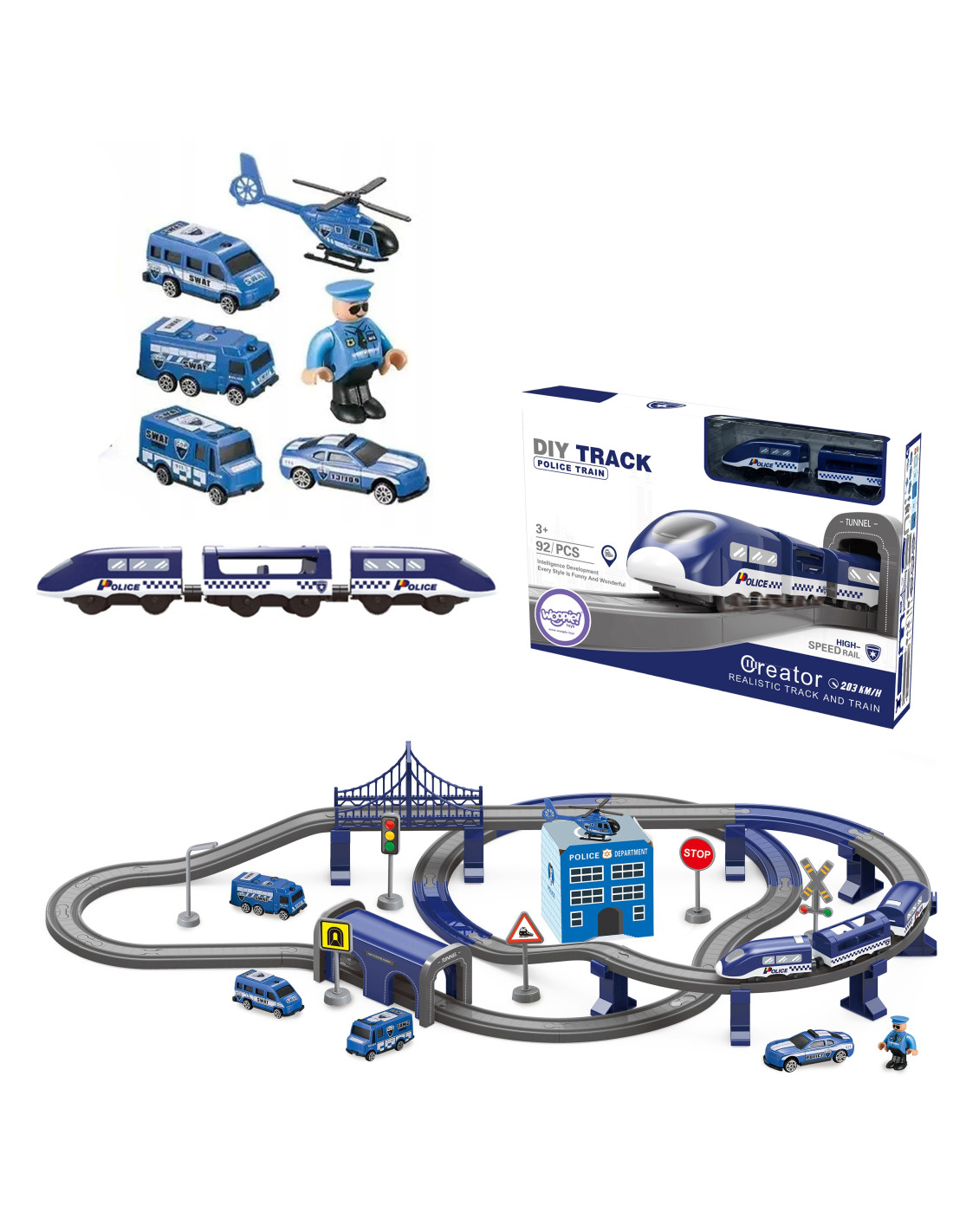 The Police Station Electric Train from the renowned Woopie brand is the perfect choice for your little automotive enthusiasts. This colorful train will delight children of all ages, providing numerous attractions and endless excitement. The set contains 92 pieces , including a modern battery-powered locomotive, track elements, police cars , and a helicopter. This toy offers not only tons of fun but also vast developmental opportunities for children. It particularly develops spatial awareness, technical skills, and, of course, imagination. The train is packaged in a unique box, making it perfect for a gift.