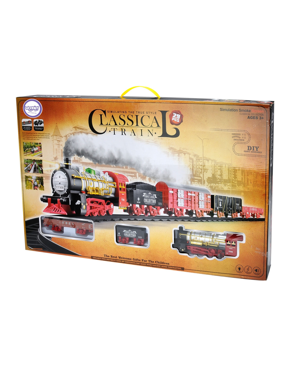 WOOPIE Pociąg Classical Train + 29 akcesoriów to wspaniały produkt, który zapewni każdemu małemu motorniczemu mnóstwo radości i zabawy. Produkt wykonany z wyjątkową dbałością o każdy szczegół. W skład zestawu wchodzi: tor, lokomotywa, węglarka, wagony. Zabawa pobudzi u każdego dziecka kreatywność, wyobraźnię jak również będzie rozwijać zdolności manualne. Podczas jazdy lokomotywa wydaję realistyczne dźwięki, z przodu świecą się światła, a z komina wydobywa się dym. Tory mają bardzo proste łączenia dzięki czemu montaż całej kolejki jest dziecinnie prosty! Produkt przeznaczony dla dzieci powyżej 3 roku życia.
