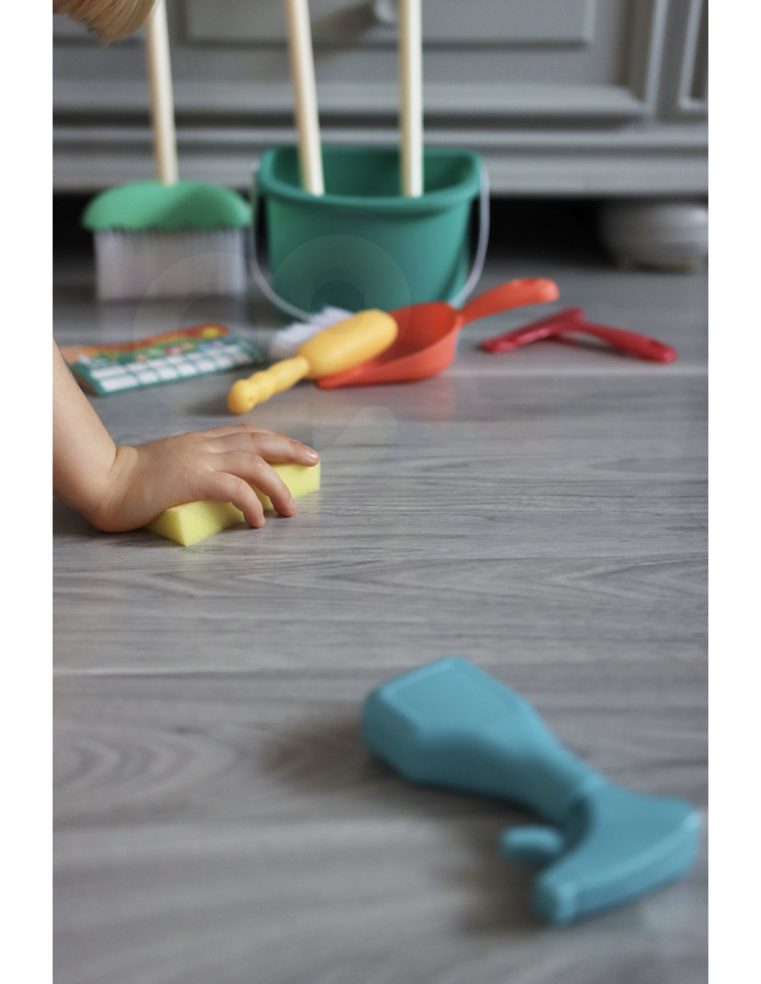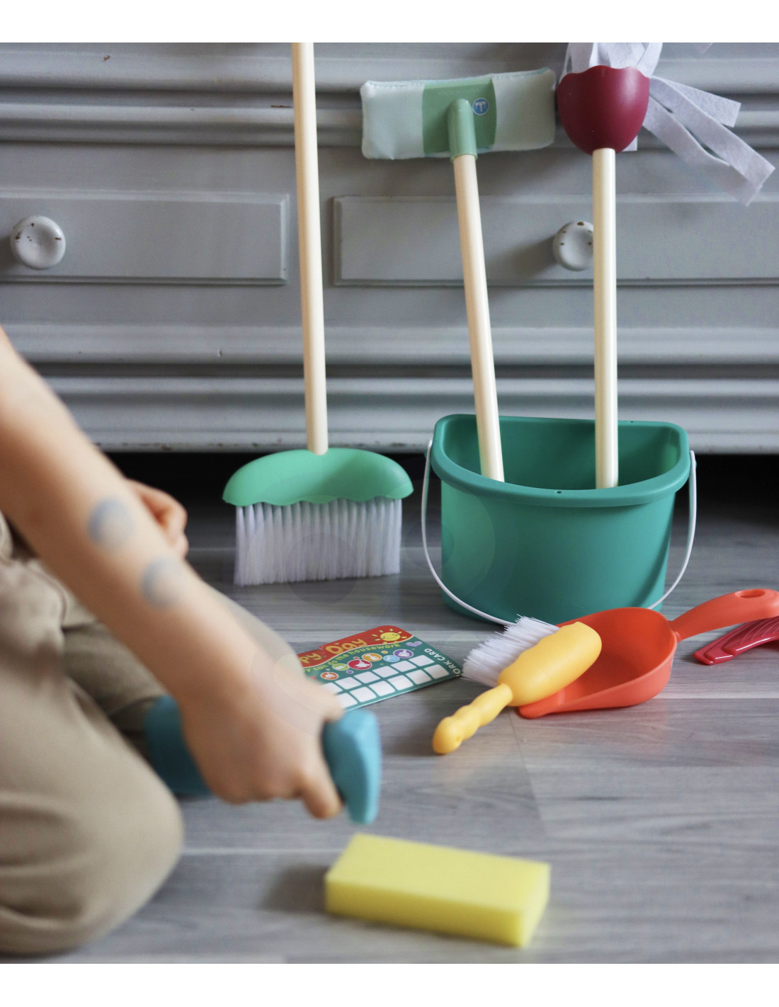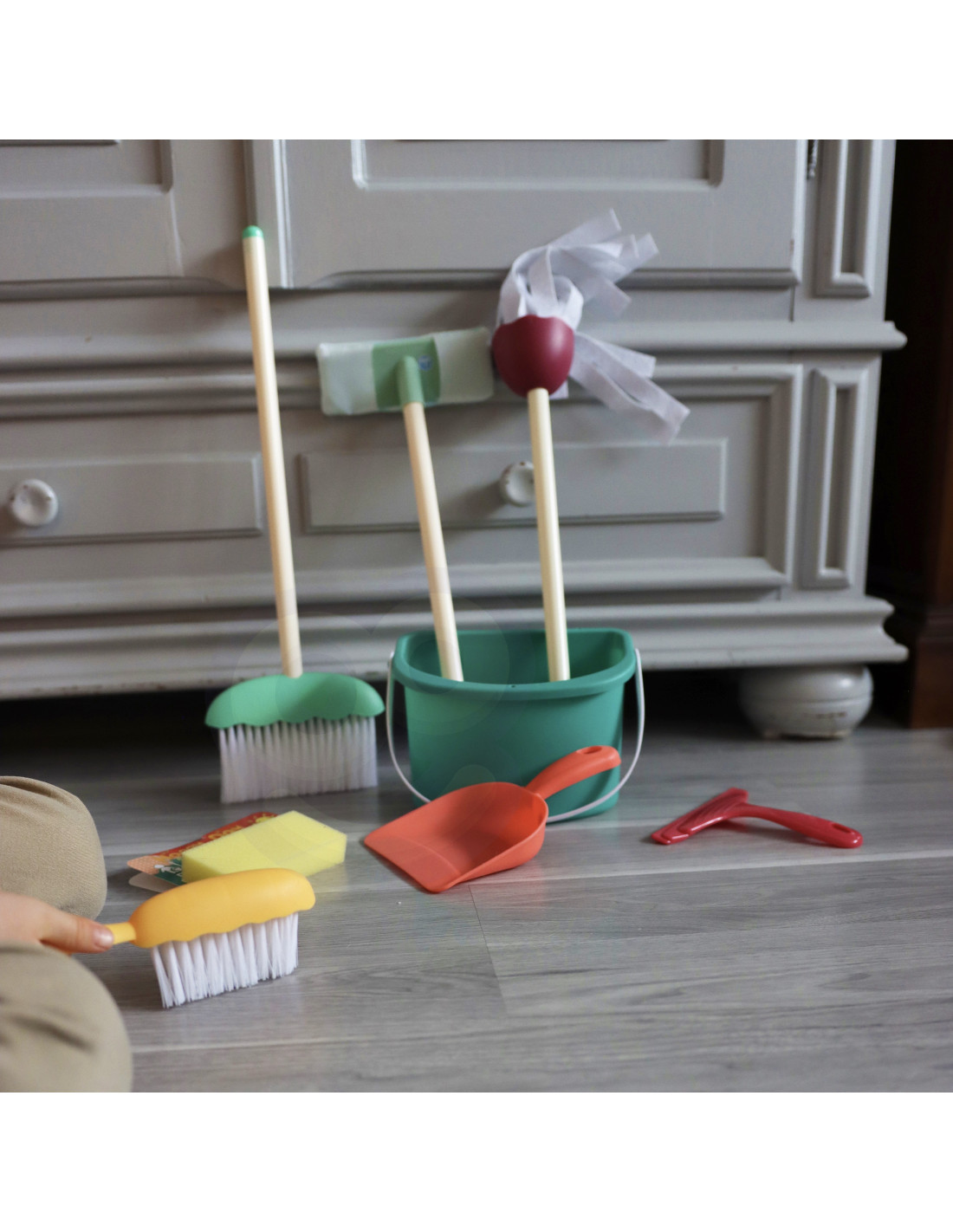 The WOOPIE cleaning set is every little helper's dream! Children love imitating their parents . This toy teaches responsibility and develops awareness of everyday responsibilities , as well as manual dexterity. This highly professional set replicates real-life equipment . The pieces are perfectly sized for children's hands .