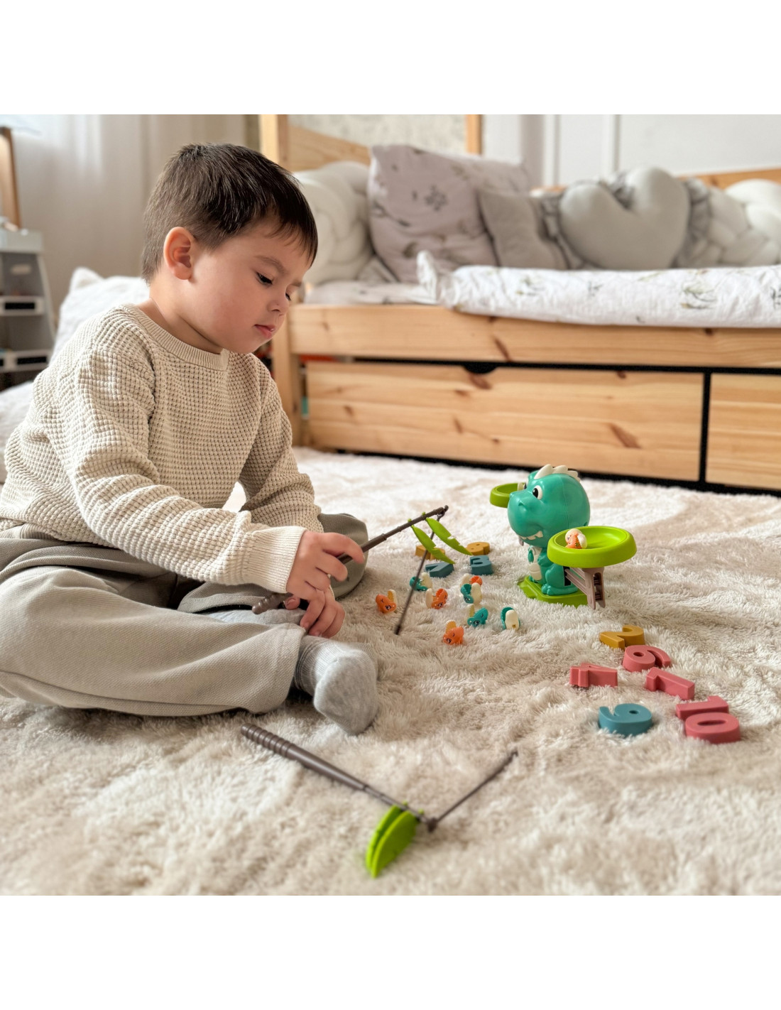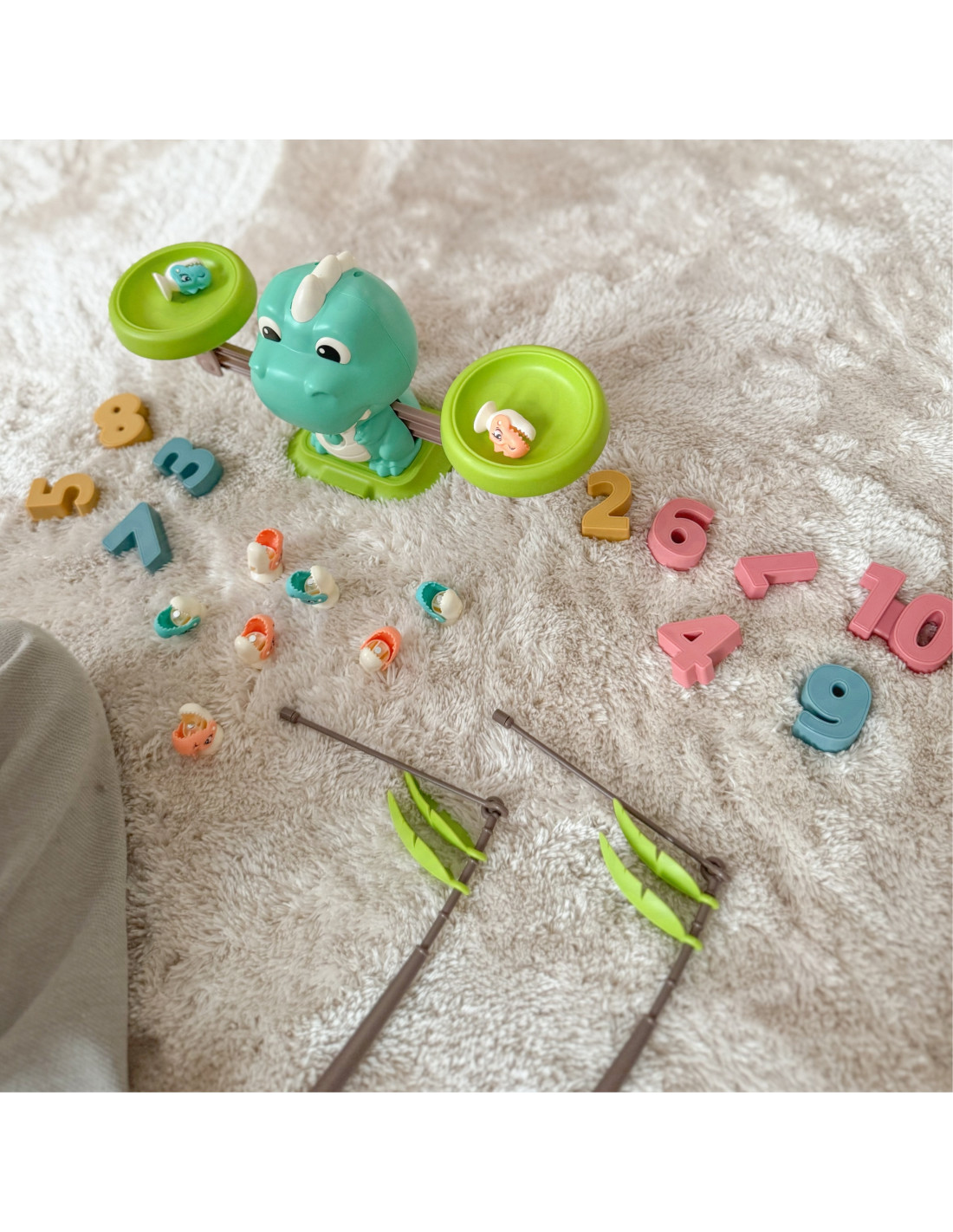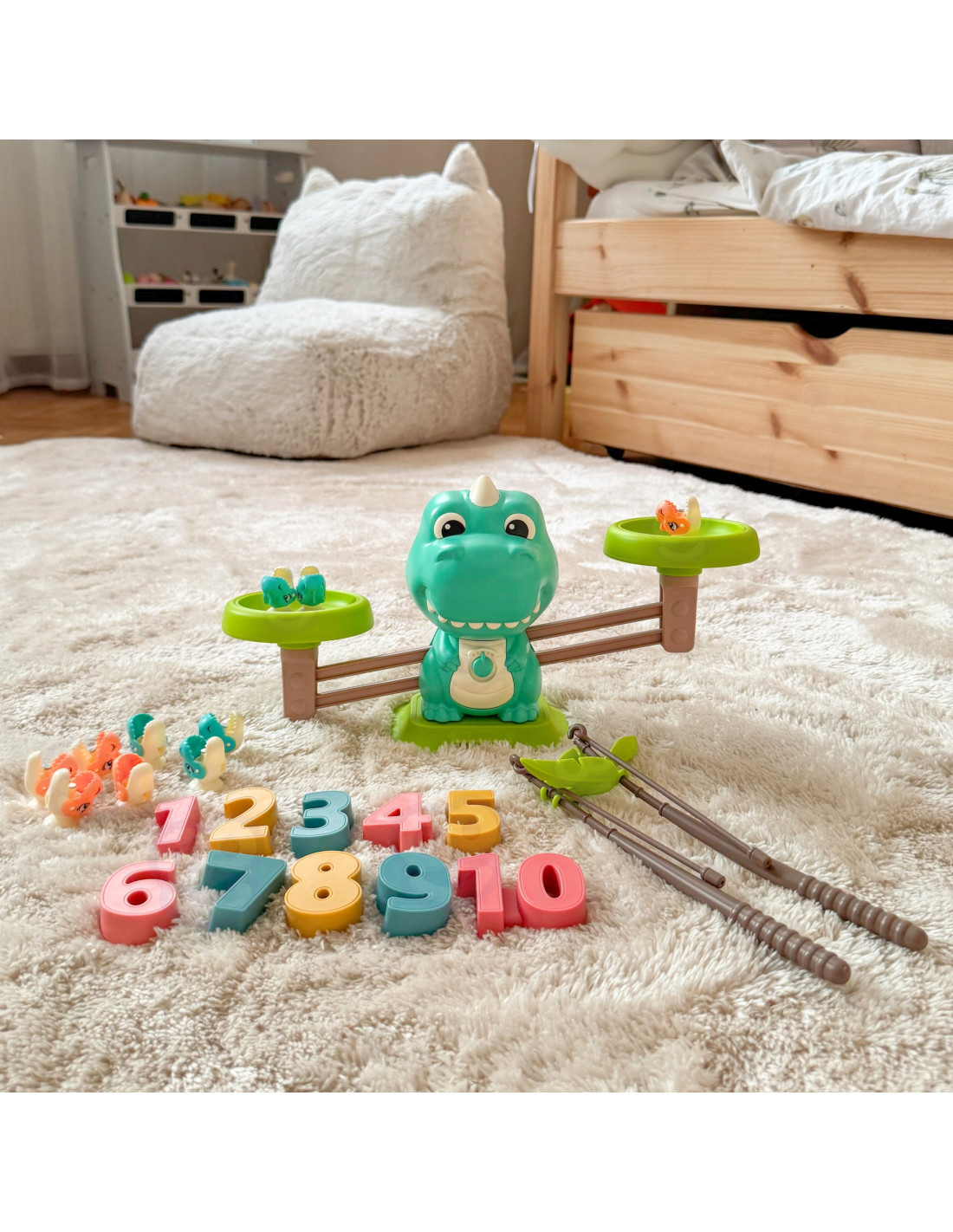 The WOOPIE Dinosaur Balance Beam will encourage learning about the world, numbers, and math, and in between, you can take a break for a game of dinosaur fishing ! A large dinosaur sits on the base, allowing you to play with a scale. Behind the dinosaur, there's room for fishing rods, and you can attach the leaves from the set to them. The set includes 10 weights ; one weight corresponds to one animal from the set, meaning weight 1 corresponds to one dinosaur, weight 2 corresponds to two dinosaurs, and so on. Additionally, there are cards with operations and answers. This toy is perfect for stimulating imagination , encouraging creative and unconventional thinking, and also wonderfully developing manual dexterity in young children. It also provides lots of fun while learning.