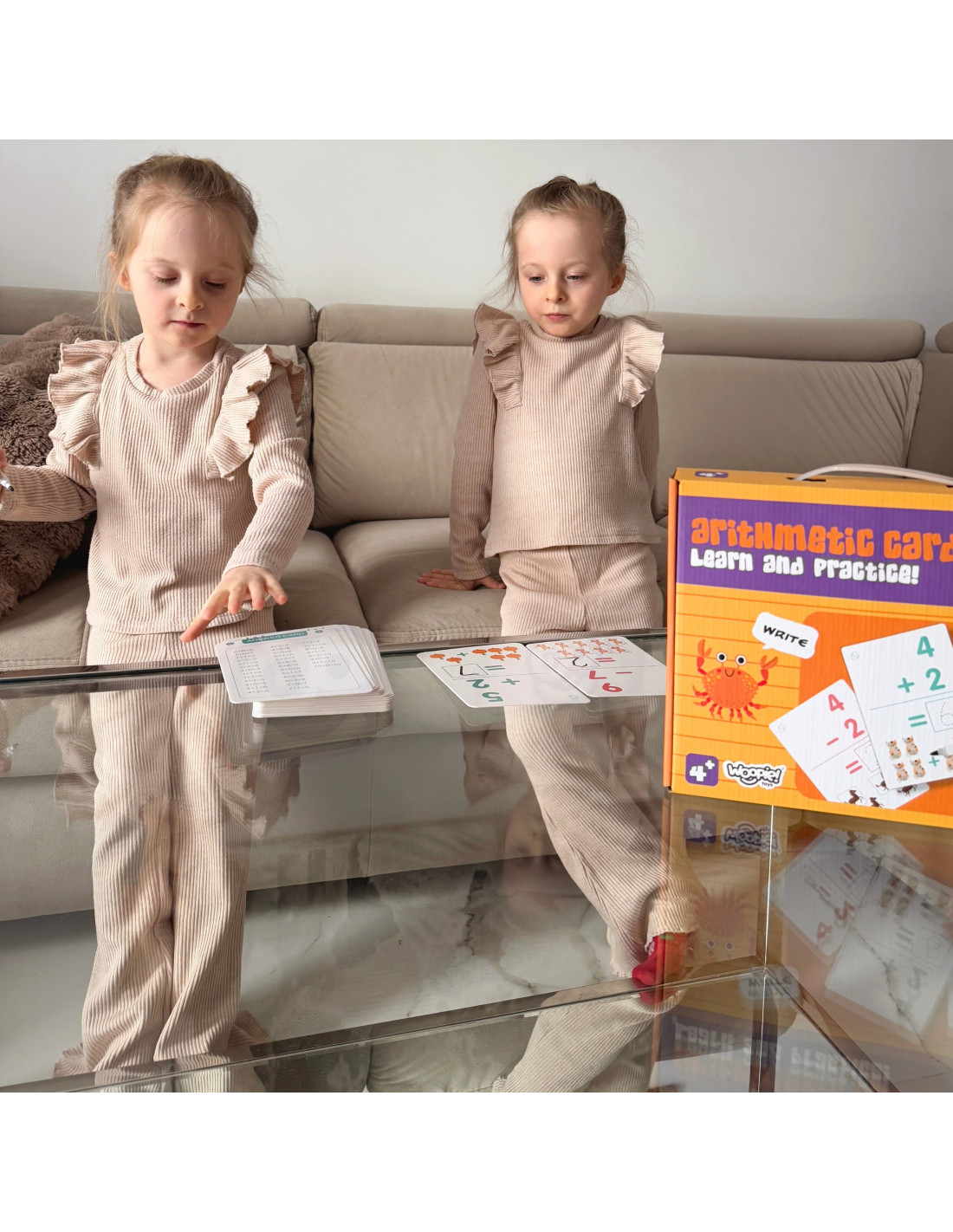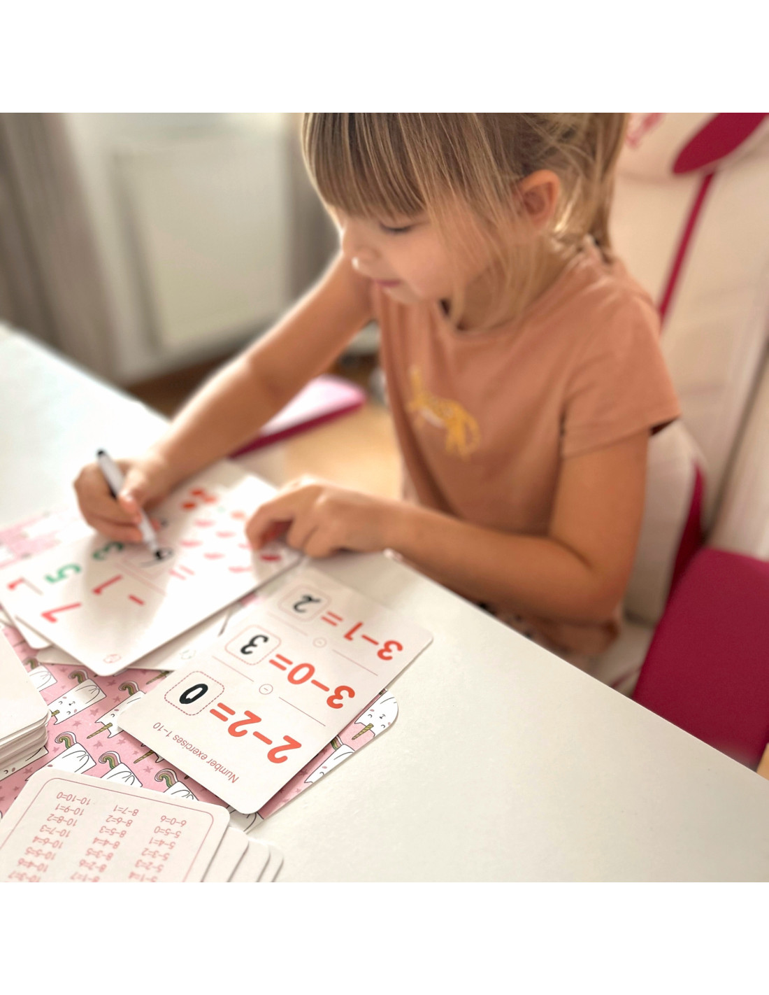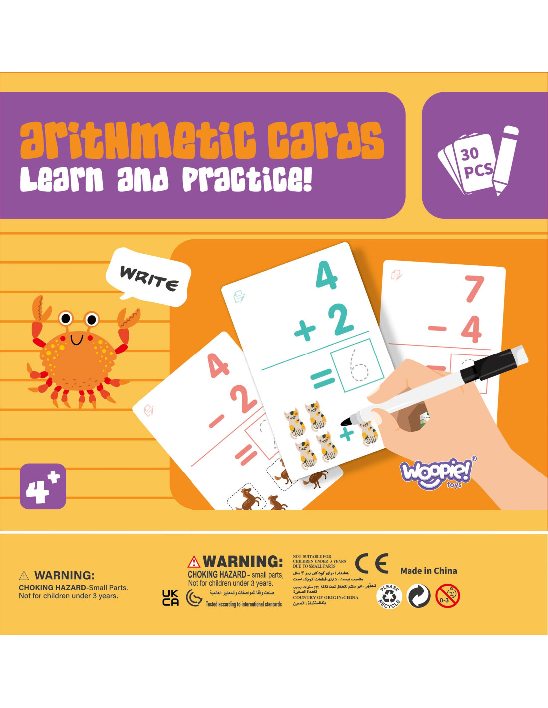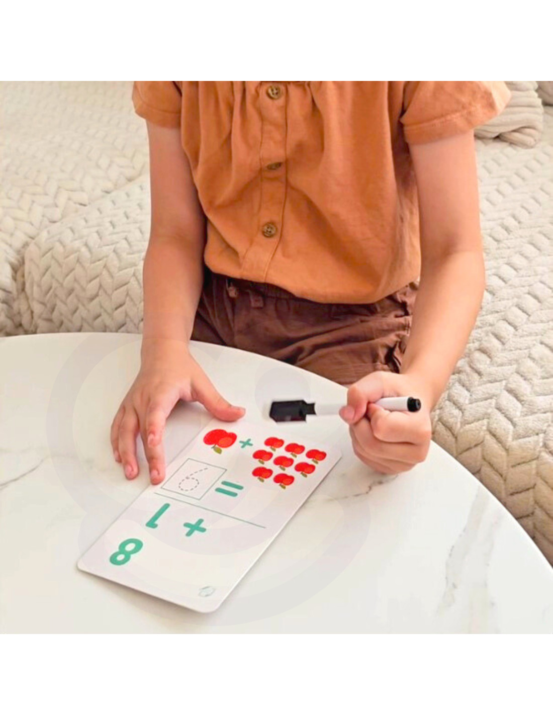 WOOPIE counting flashcards are a great gift idea for our little ones. This fantastic set consists of 30 double-sided cards that encourage children to learn numbers and count . The set is designed so that children can practice counting repeatedly thanks to the included erasable marker . The cards are divided into subtraction and addition sections. To facilitate learning, the cards have two levels – at the beginning, children can use the side where mathematical operations are enhanced with pictures , which they can use to help them calculate the result. The other side of the cards presents calculations without the help of pictures . Thanks to this learning module, your child won't feel pressured by the difficulty of new knowledge , and solving math problems will be pure pleasure ! To motivate your little one to learn, after each correctly solved example, you can draw a heart in the corner of the card!