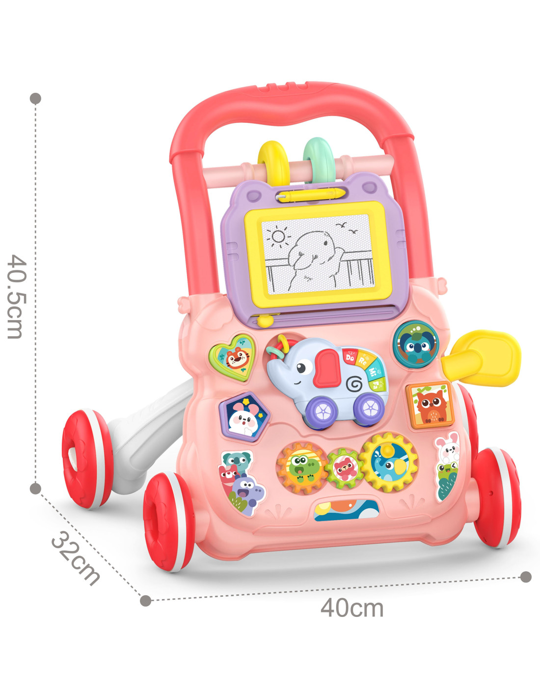 The interactive baby walker from WOOPIE is more than just a toy – it's a true companion for your child as they explore the world. It combines many features that stimulate their development on various levels. The walker features a sketchpad that sparks their creativity, allowing them to create their own drawings and patterns . The toy also features an interactive elephant that cheerfully plays melodies when buttons are pressed. The toy also includes a set of blocks in various shapes, printed with animal images . These elements introduce the child to learning about shapes, colors, and animals . Moving gears , which start spinning when turned, further engage the child and introduce an element of surprise. Safety during play is ensured by a locking wheel system , which ensures the walker remains stable even during the toddler's first hesitant steps. A mirror on the walker allows the child to explore their own reflection, which is an important element in developing self-awareness.