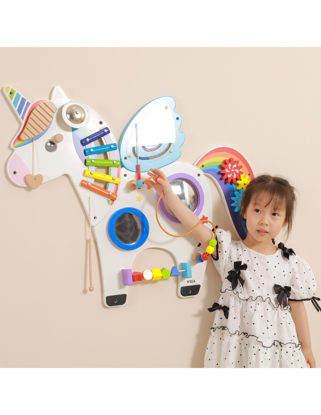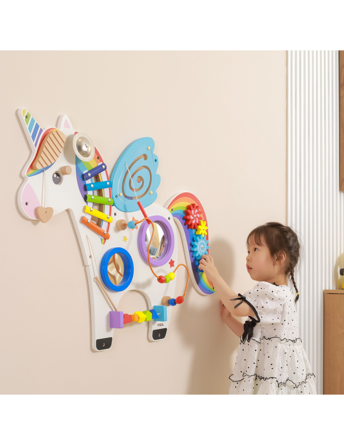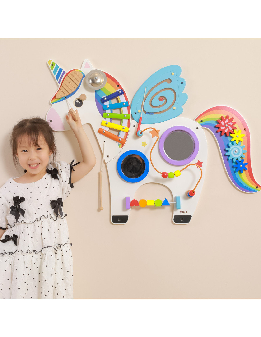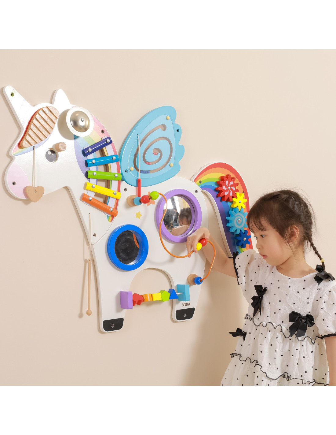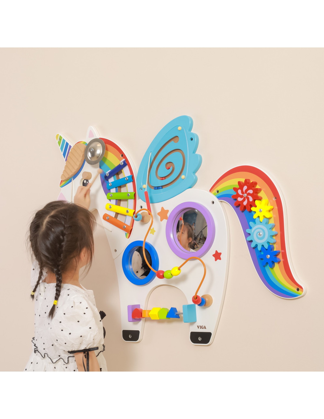 A multifunctional wall board with a charming unicorn design. This board is a toy that multiple children can play on simultaneously. They can not only have fun but also learn a lot. It helps develop colors, sounds, and graphics. It also develops hand-eye coordination and social skills. A brilliant toy combination for schools, preschools, learning centers, and public spaces.