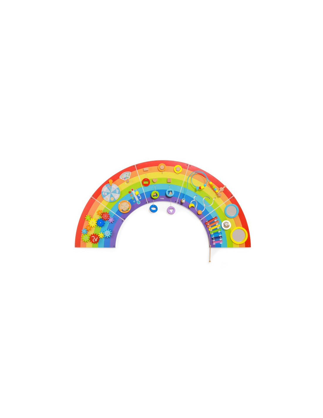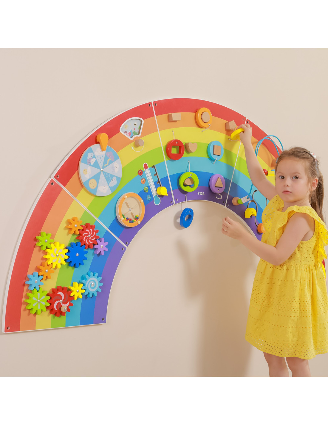 The Rainbow Sensory and Manipulative Board by Viga Toys is a wooden, multi-functional wall toy that will provide children with hours of fun. Among the various activities, you'll find 12: rotating gears, a weather board, a rolling disc, a block matching, a xylophone, a concave and convex mirror, a gong, and a bead intertwining. The weather board is specially designed to fit the rainbow theme. The changing seasonal panel can be explored in conjunction with weather changes and temperature fluctuations. Divided into 5 parts for easy transport and assembly. All 5 parts are the same size, so they can be assembled in any order. The curved design encourages children of all sizes to play and learn basic concepts about colors, shapes, sounds and weather at the same time. This toy is designed to stimulate the senses and support the development of children's motor skills . It's an excellent exercise for dexterity in little fingers . It also teaches logical thinking and patience. It's an ideal addition to early learning environments and childcare facilities.