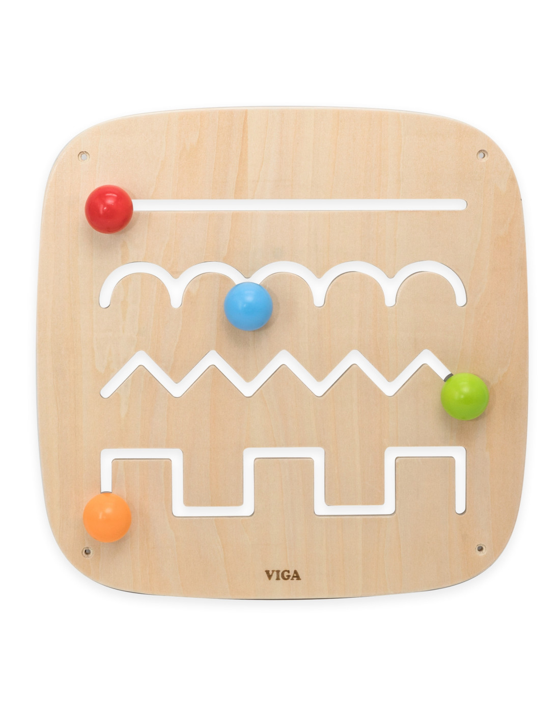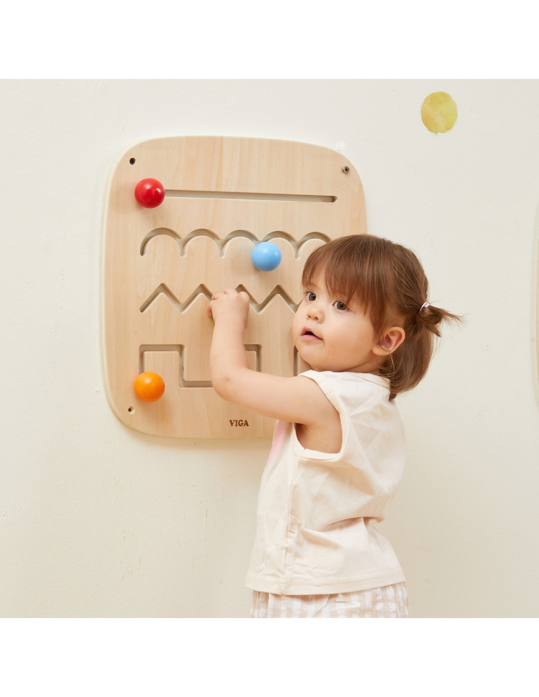 This wooden manipulative board is the perfect learning tool for play, designed for toddlers aged 12 months and up . It helps develop hand-eye coordination and fine motor skills , introducing toddlers to a world of diverse lines and shapes in an interactive way. The board features four sliding tracks with different patterns – straight, wavy, zigzag, and block-shaped. Each track comes with a colorful ball with an easy-to-grasp handle designed for little hands. By moving the balls, children discover the different characteristics of lines, practice color recognition, and learn concepts like angles and curves . The board is easy to mount on the wall, and its sturdy wooden construction ensures durability and safety during play.