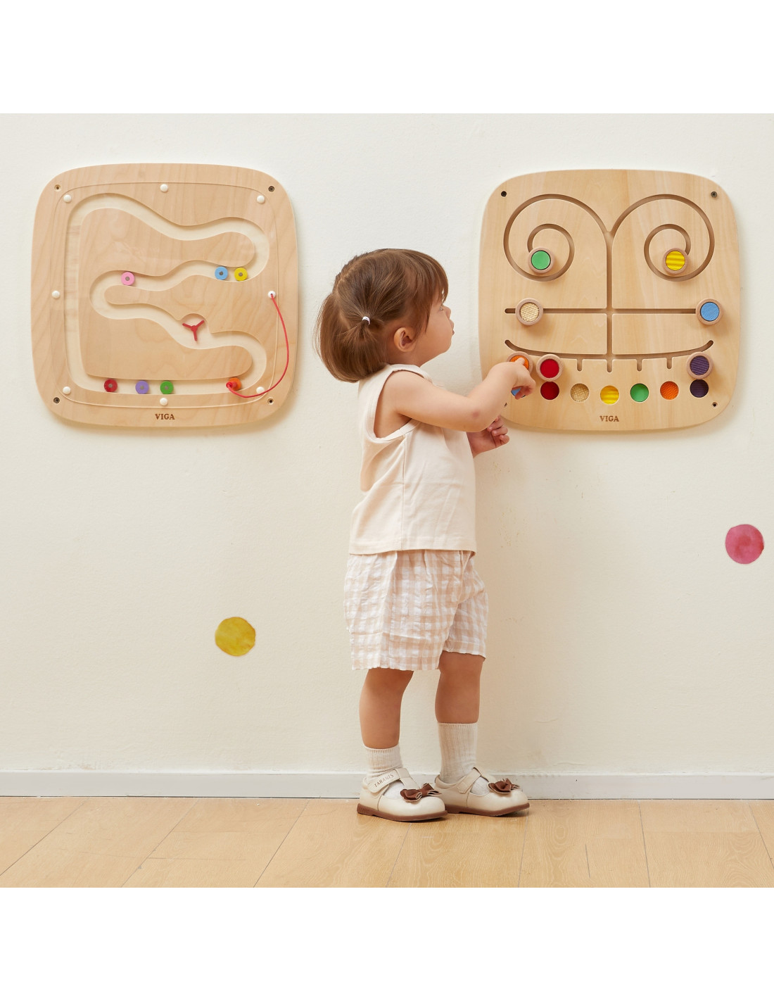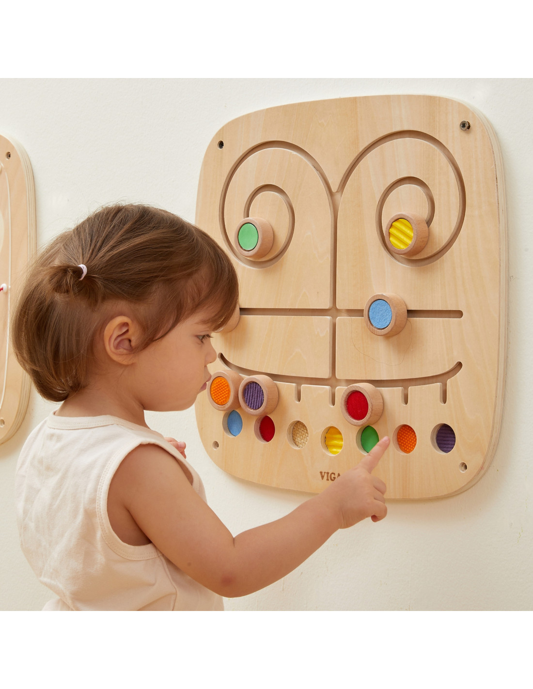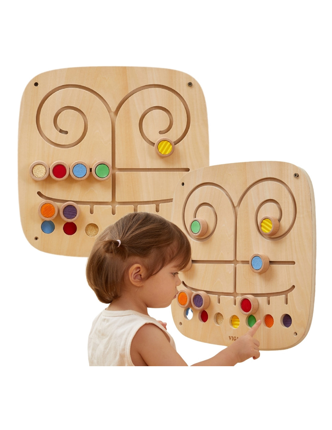 Discover the "Touch and Match" wall panel from VIGA , a wonderful educational toy focused on developing children's sensory and visual perception . The panel features seven unique textures and colors that toddlers can move around in a maze, matching them together. Playing teaches recognition and differentiation, develops cognitive skills , and develops sensory awareness and concentration . This wooden panel is the perfect addition to a play corner in a child's room, preschool, or nursery. Let your child explore the world around them through their senses. This toy provides hours of fascinating learning combined with fun, while its robust construction ensures durability and safety.