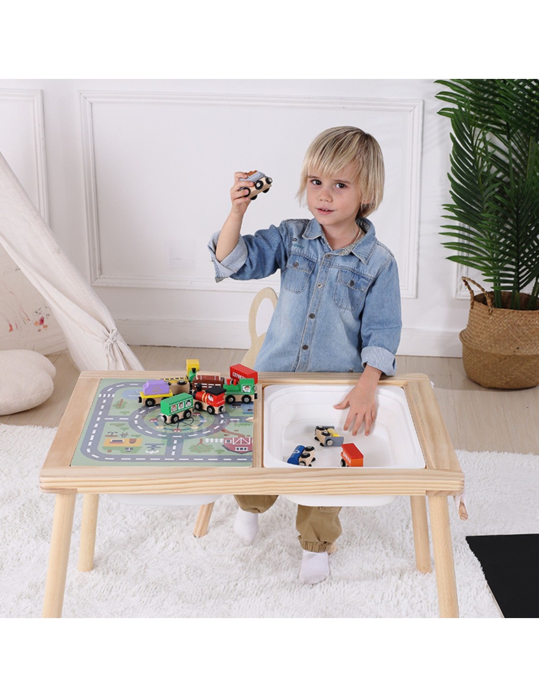 - - Double-sided tabletop , on one side a city map where you can drive cars, on the other a black board for drawing and writing with chalk