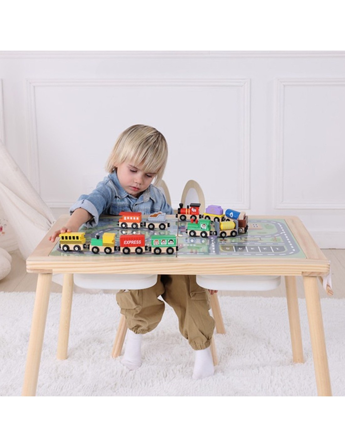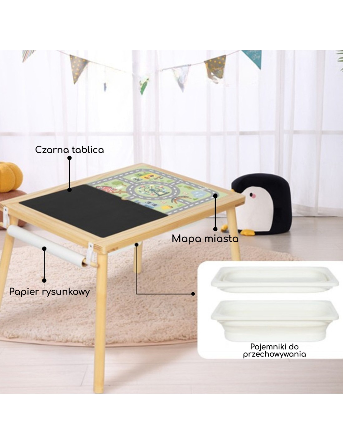 The wooden activity table from Woopie Green is the perfect play space for a little artist and explorer! Thanks to its clever design, children can draw with chalk on a blackboard, play with cars on a city map, create drawings on a roll of paper, or freely use the tabletop for stacking blocks and creative play. Its solid wood construction and ergonomic dimensions make the table ideally suited to the needs of young preschoolers. This piece of furniture not only provides hours of engaging play but also fosters the development of imagination and manual skills.