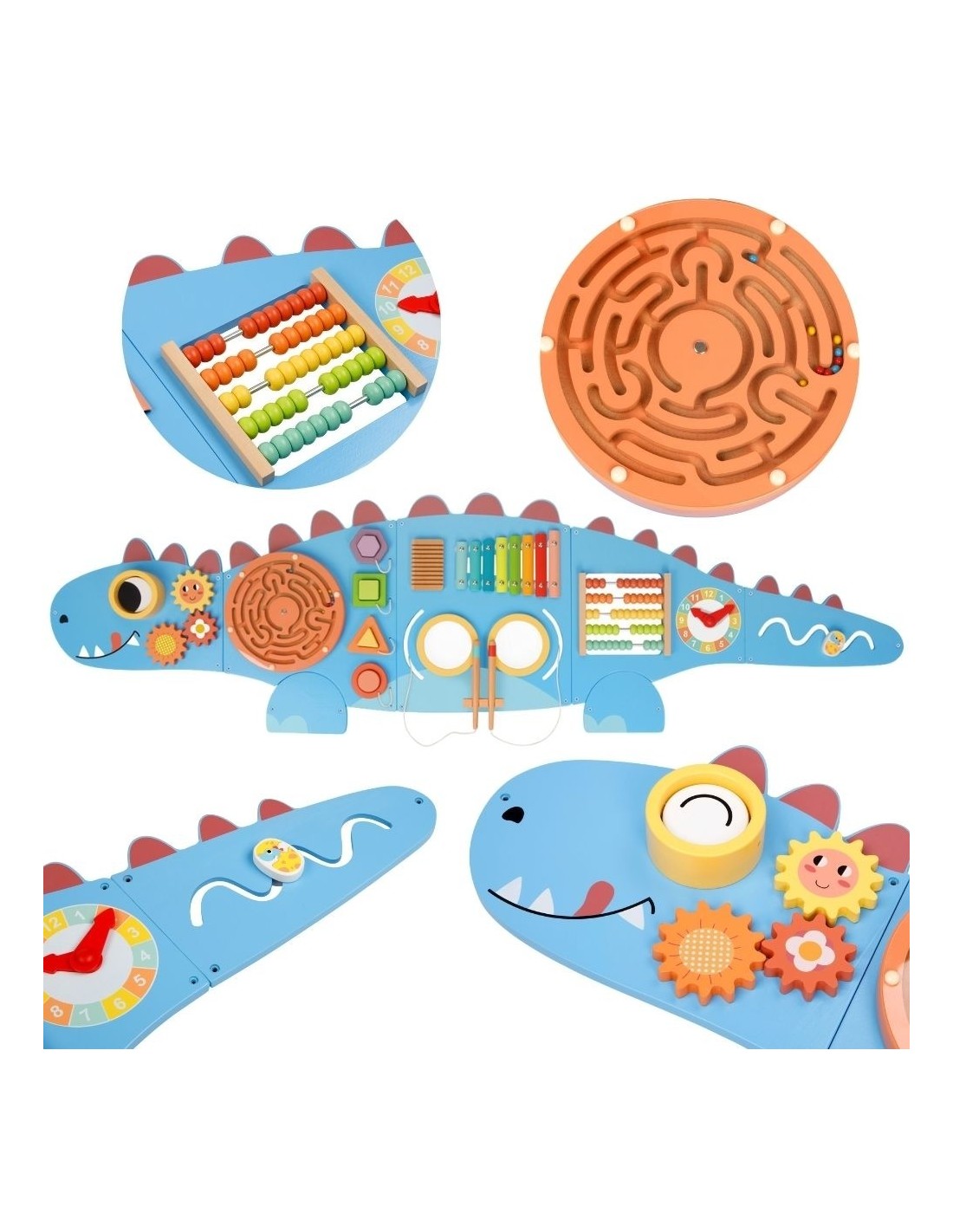 Discover the magical world of dinosaurs with a touch of educational adventure! This unique wooden activity board, shaped like an adorable dinosaur, is a true entertainment center for little explorers. Six diverse panels offer a wealth of activities that will keep your child occupied for hours while developing key skills. Each element has been thoughtfully designed to stimulate cognitive curiosity and provide the joy of independent discovery.