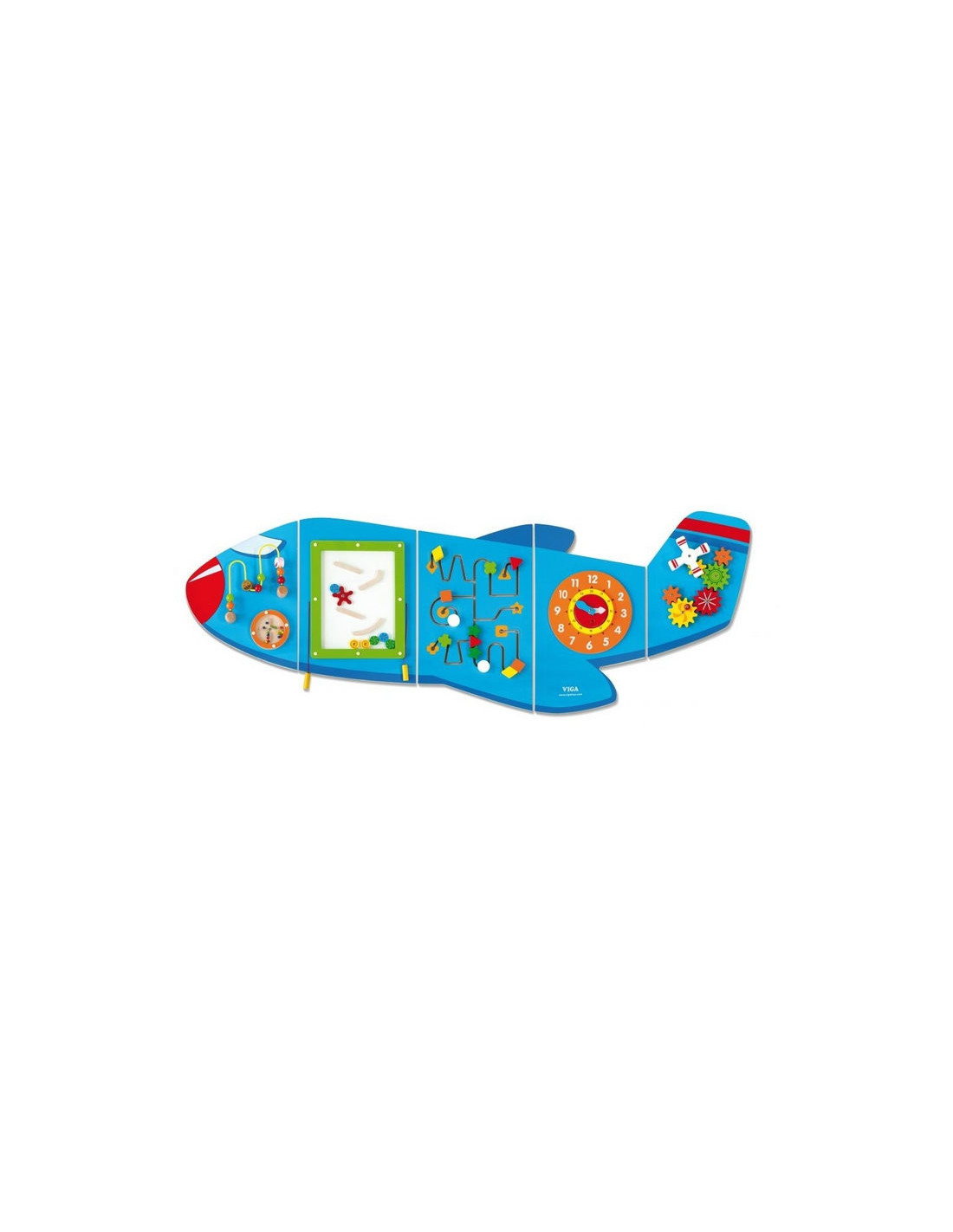 Samolot XL marki Viga to drewniana, wielofunkcyjna zabawka na ścianę. Całość składa się z 5 elementów, które w połączeniu tworzą samolot. Każdy element zapewni dzieciom inny rodzaj aktywności. Znajdziemy tutaj labirynt, przeplatankę (pętlę motoryczną), mini zjeżdżalnię, zegar z ruchomymi wskazówkami a także kolorowe, ruchome trybiki.