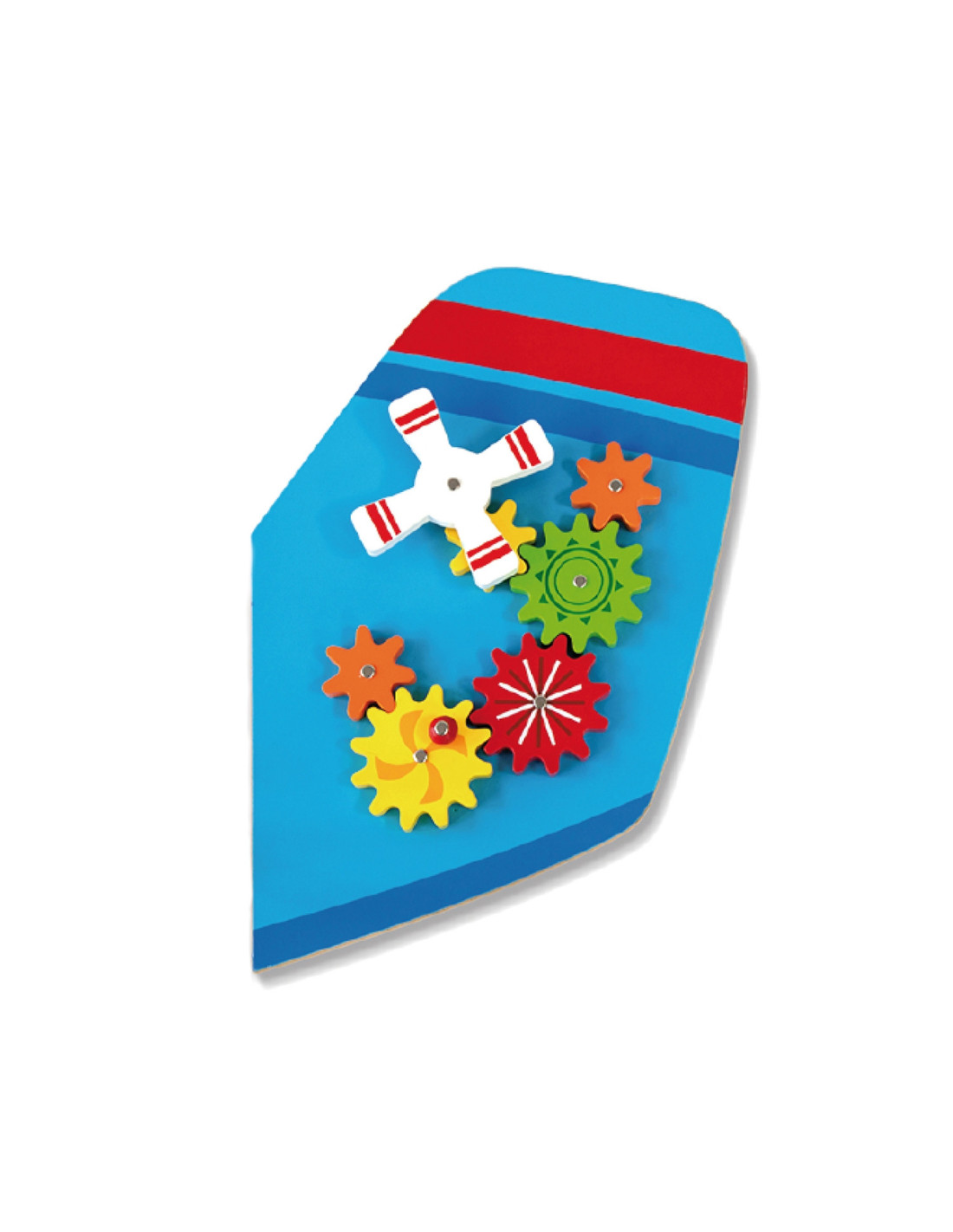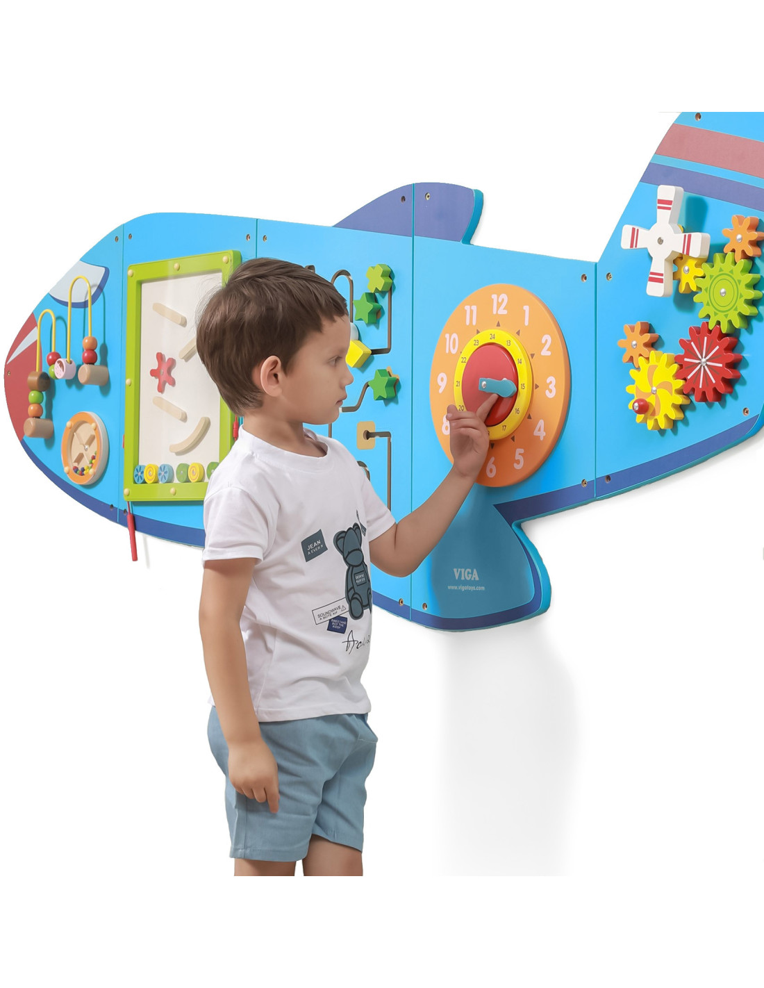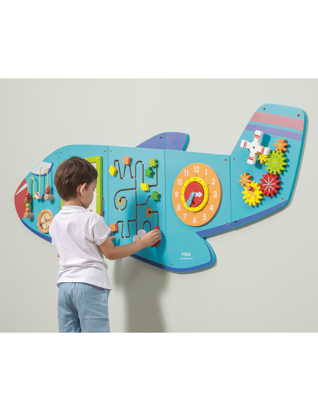 The Viga Airplane XL is a wooden, multi-functional wall toy. It consists of five elements that, when combined, create an airplane. Each element provides children with a different type of activity. It includes a maze, a motor loop, a mini slide, a clock with movable hands, and colorful, moving gears.