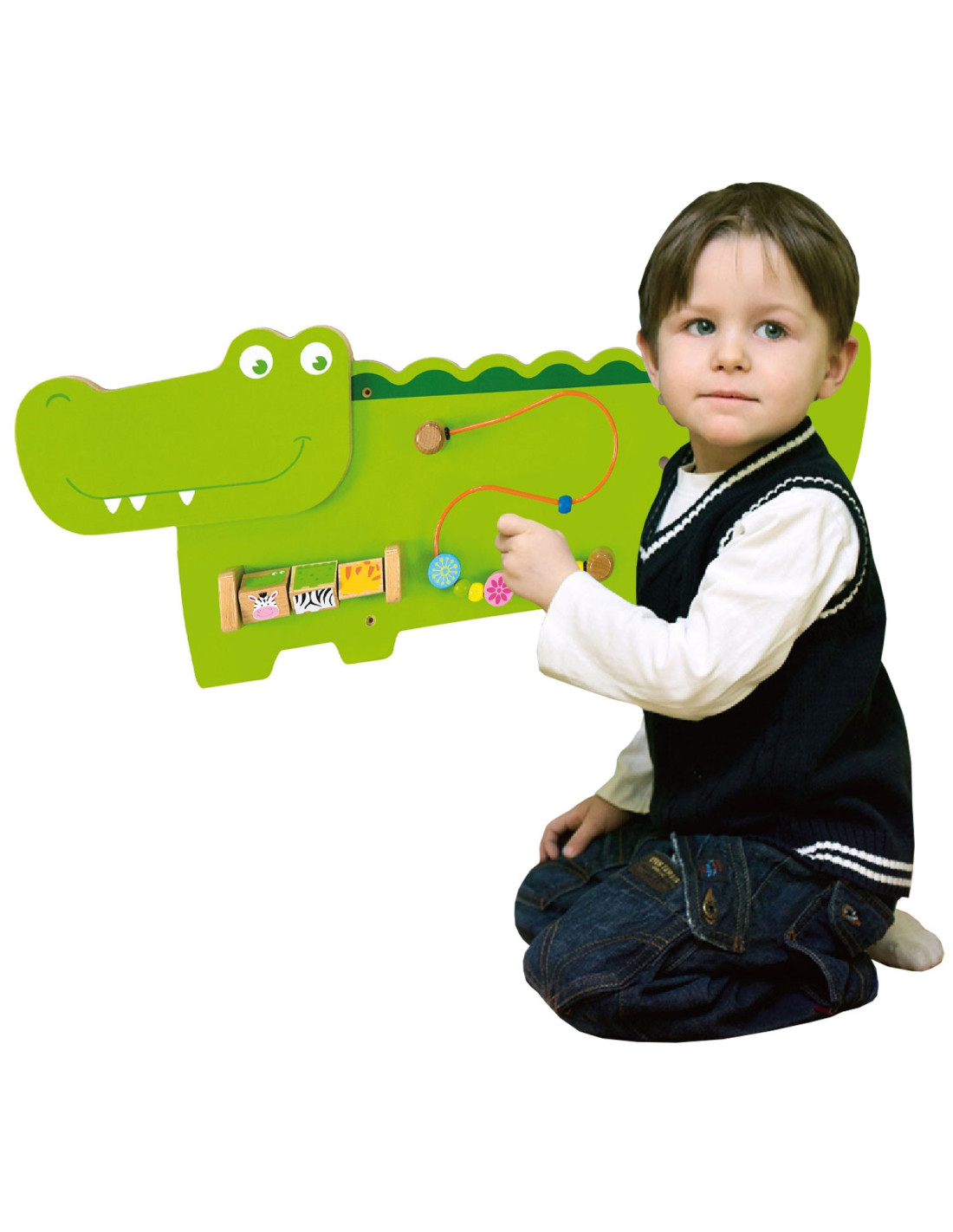 - - drewniana tablica sensoryczno-manipulacyjna w kształcie zielonego krokodyla przyciąga wzrok i zachęca do zabawy,