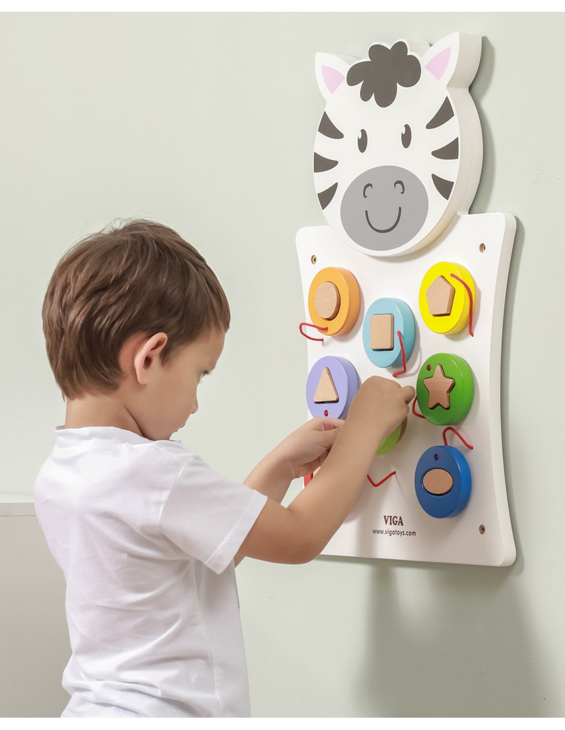Drewniana Gra ścienna "Dopasuj kształty" Zebra od firmy Viga to jedna z czołowych zabawek, która pozwoli dziecku wejść do świata ciekawej i kreatywnej zabawy. Gra w formie sortera wyposażona jest w drewniane wypustki, na które należy umieścić odpowiedni kształt klocka na sznurku. Taka gra wprowadzi Twoje dziecko w ekscytującą zabawę i poprawi zdolność rozpoznawania kolorów i kształtów. To zalety, których nie zastąpi żadna inna zabawka. Kolorowa gra rozwija wyobraźnię i umiejętność logicznego myślenia.