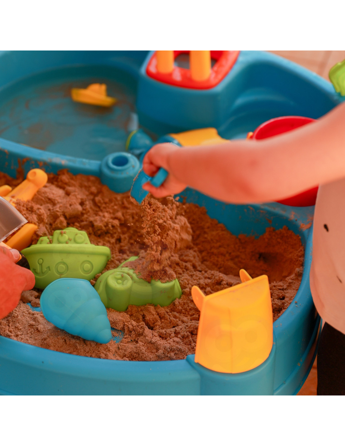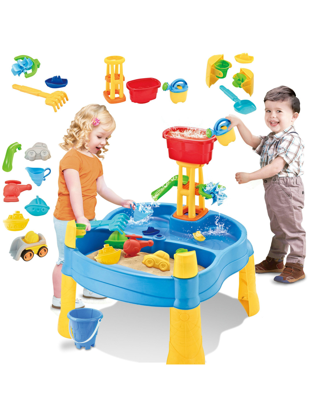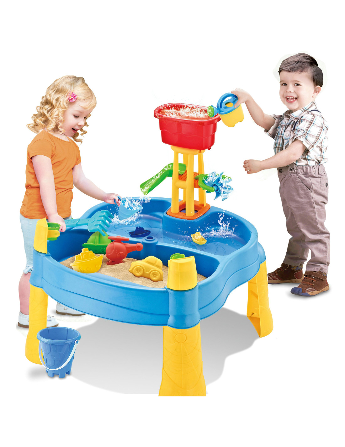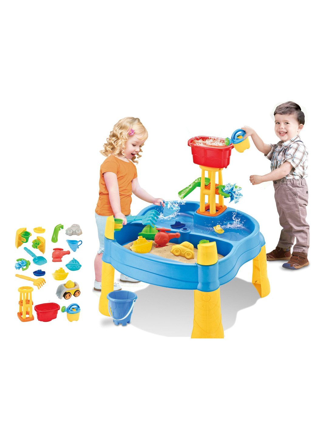 Stół Wodny 2w1 Piaskownica od marki WOOPIE jest idealną zabawka do zabawy z wodą i piaskiem. Zestaw zawiera 14 akcesoriów: 4 foremki, konewkę, młynek, łopatkę, grabki, samochodzik i 2 statki. Stolik posiada 2 wgłębienia, które jedno wypełnij wodą, a drugie piaskiem, co pozwala na zabawę wszędzie. Dziecko może wlewać wodę do młynka i patrzeć jak woda spływa. Zestaw jest przeznaczony do zabawy w domu, jak i na zewnątrz. Idealne do zabawy w domu i na plaży lub w piaskownicy.