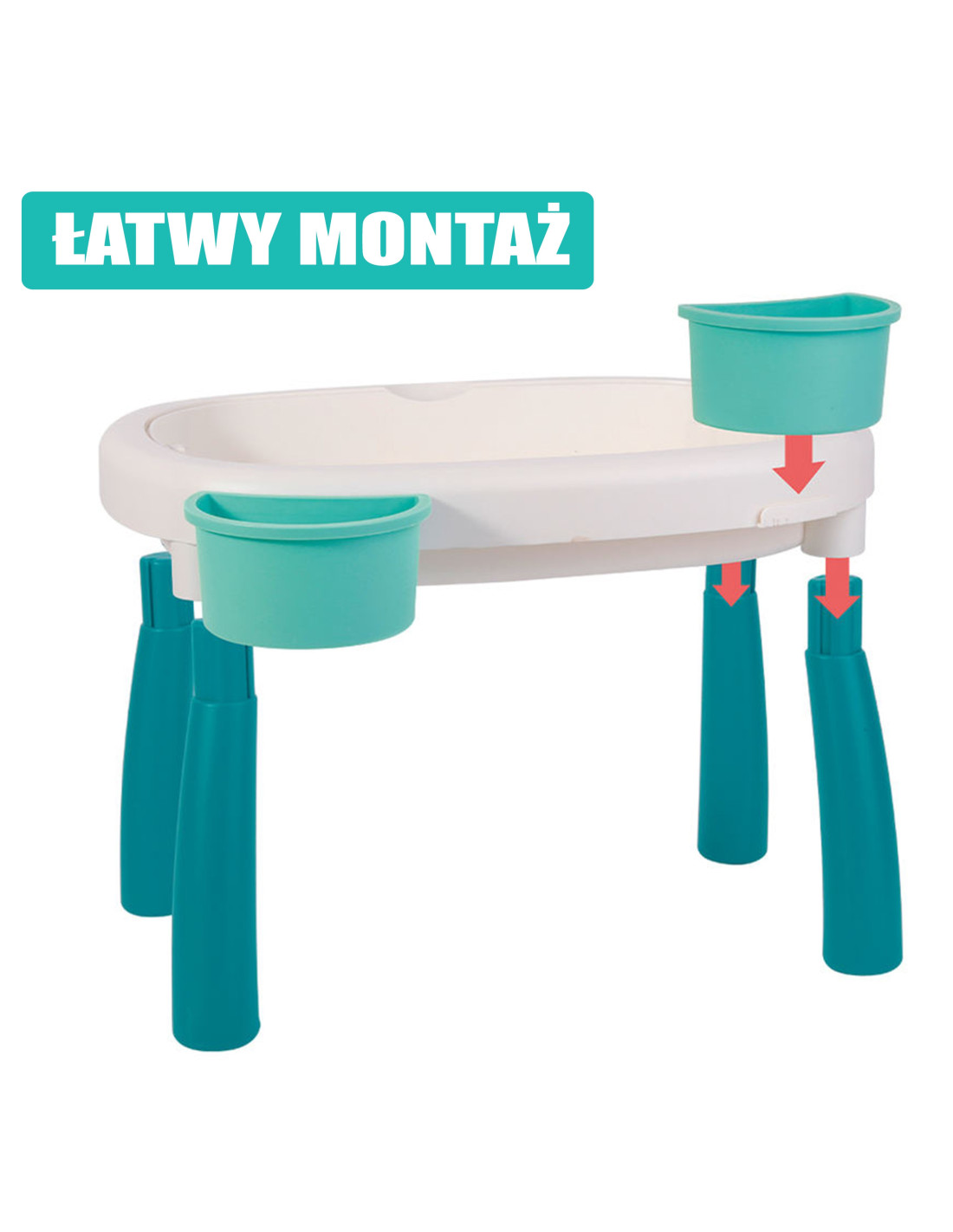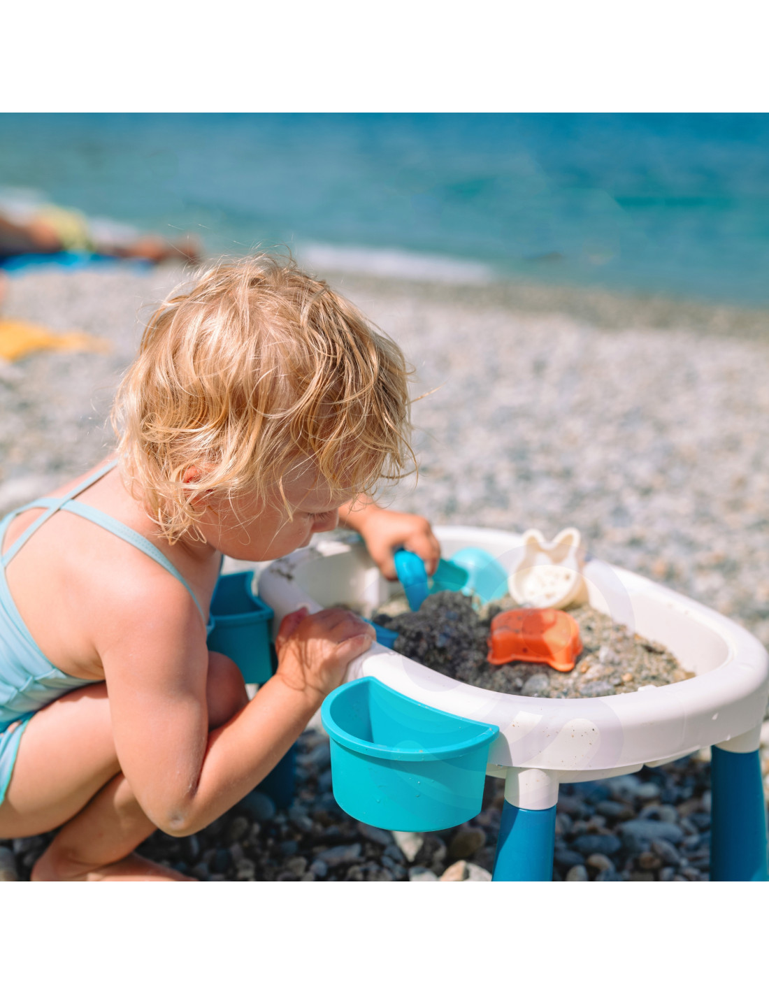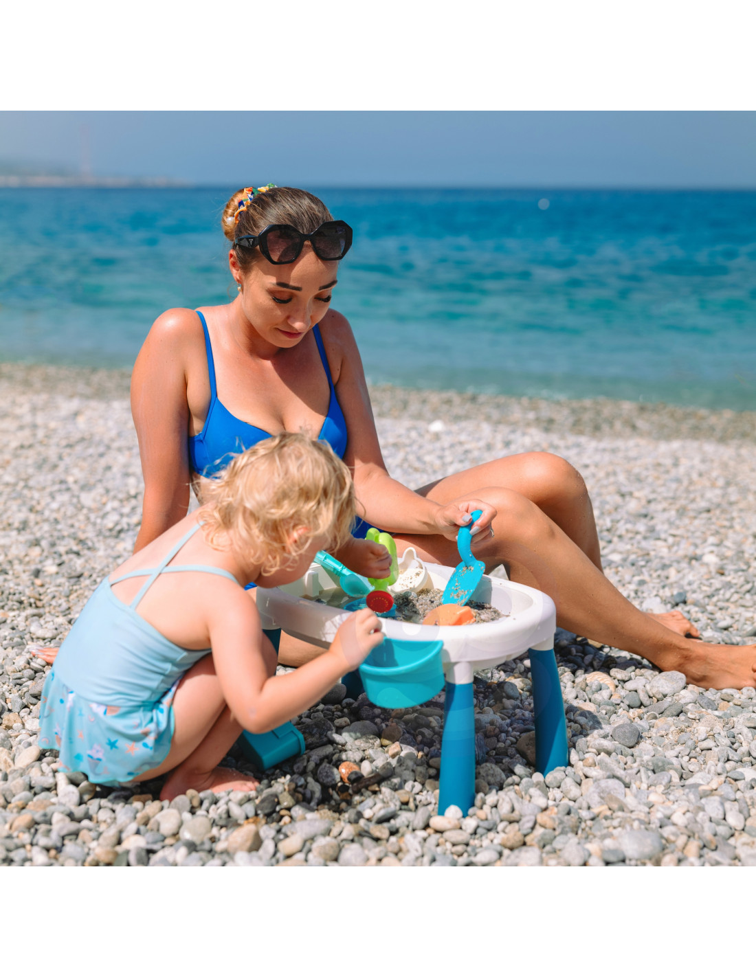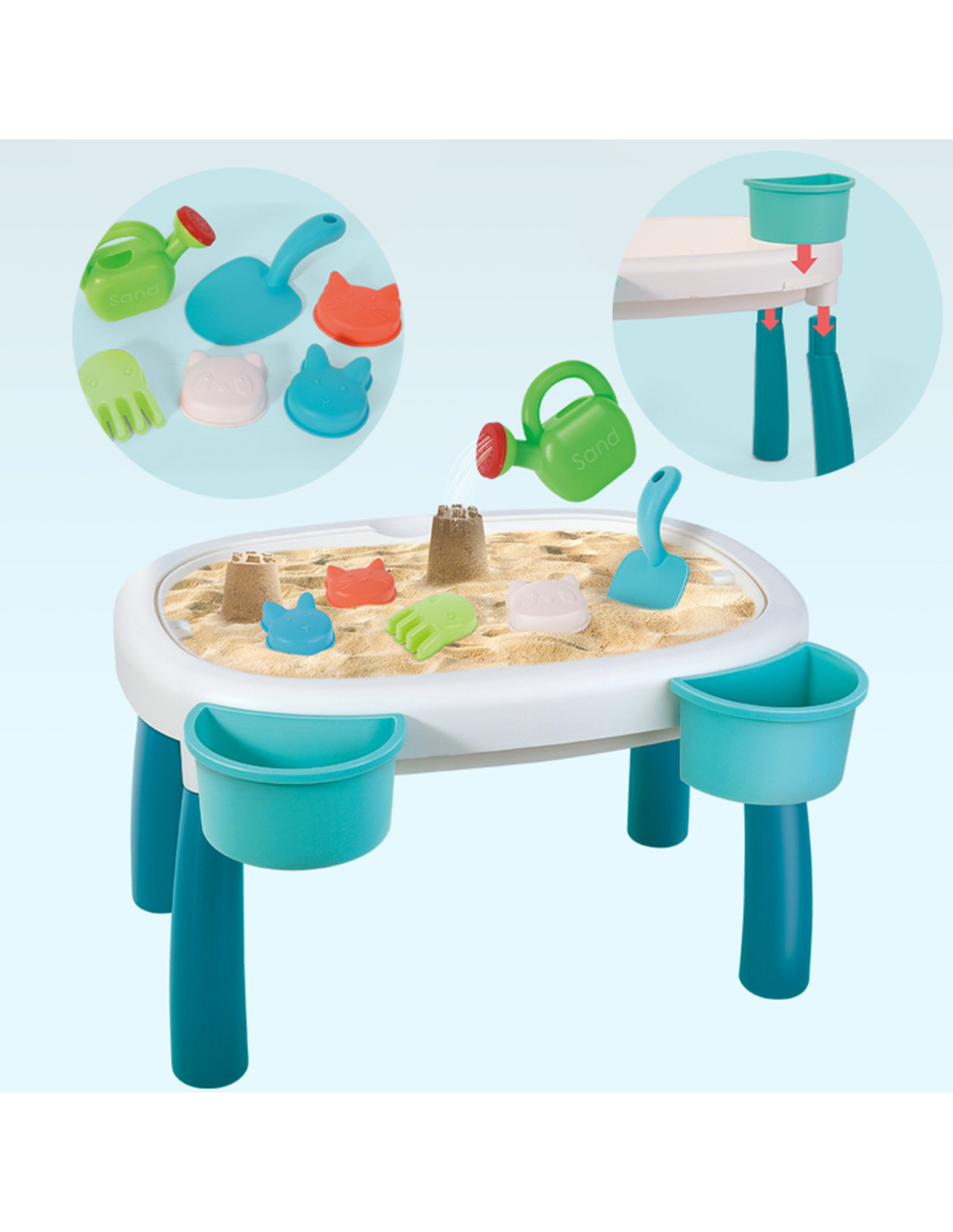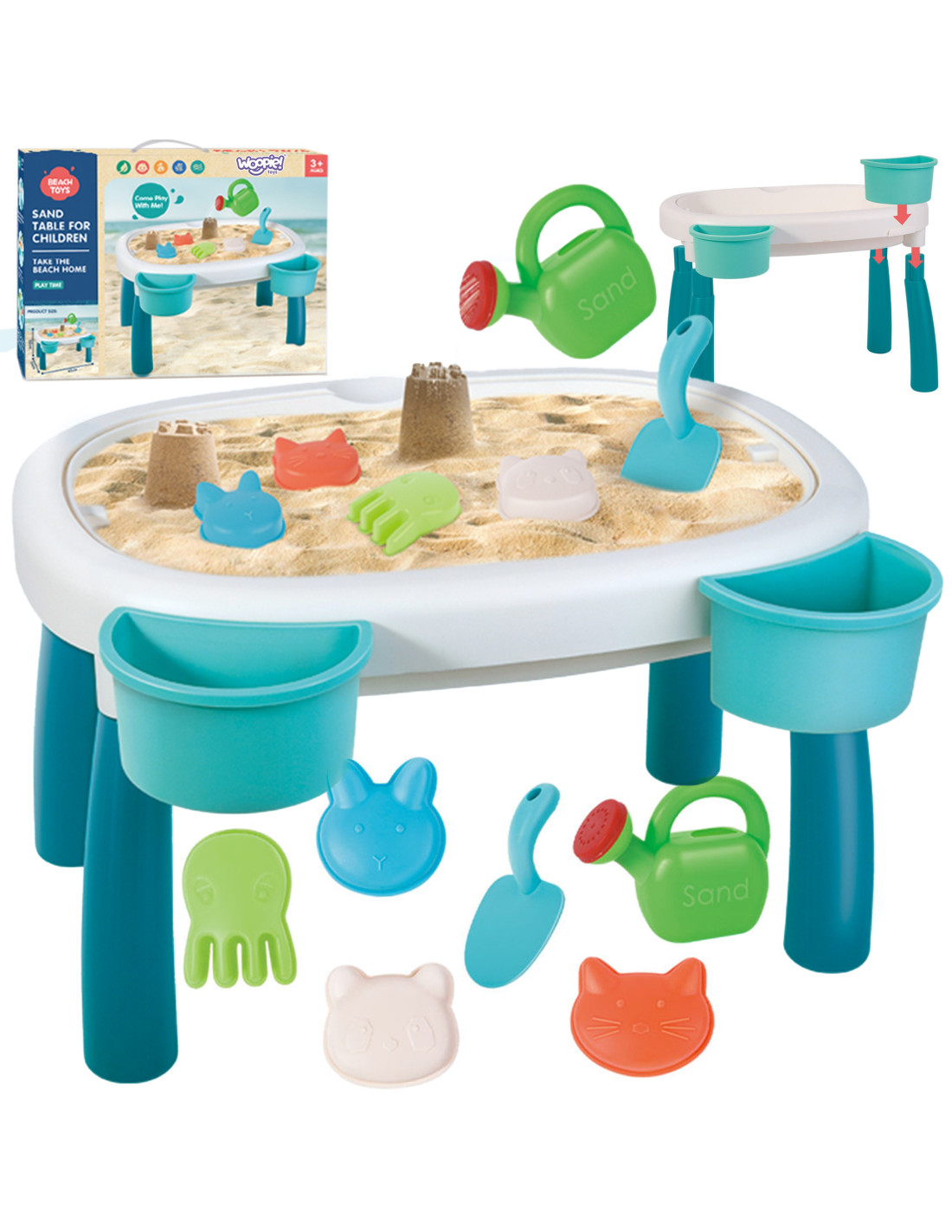 The WOOPIE Sand Table is the perfect toy for playing with water and sand . The set includes 7 pieces: a table with extendable legs and 2 containers, 4 molds ( an octopus, a cat, a panda, and a bunny ), a watering can, and a shovel. The set is designed for play at home , on the beach, or in a sandbox.