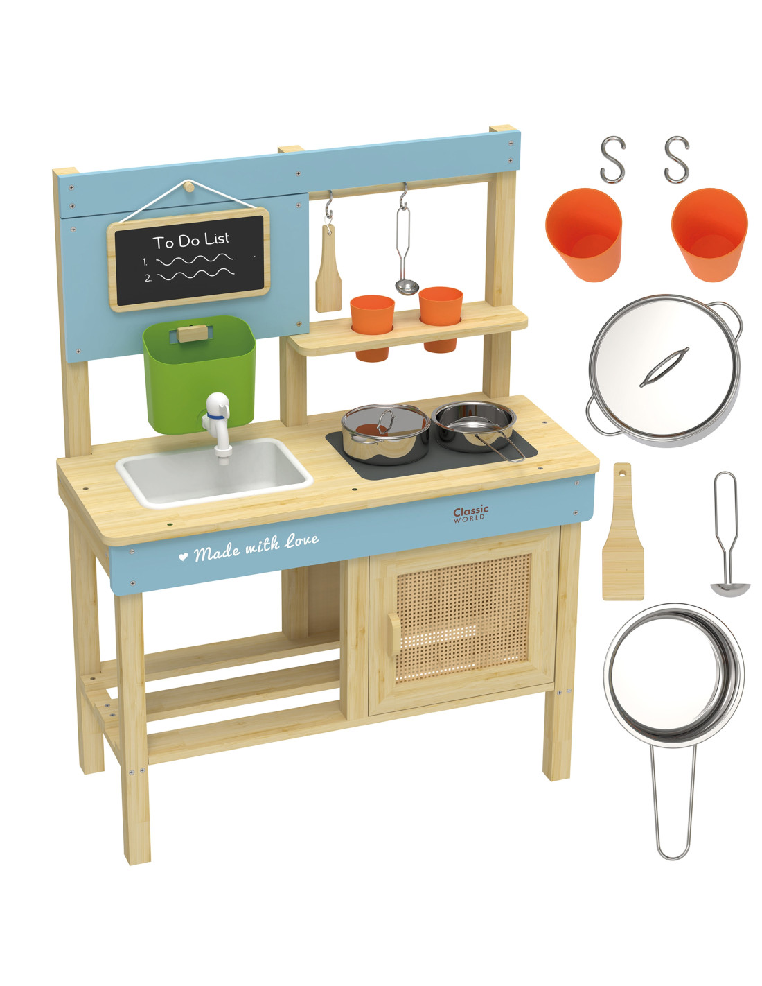 Children can have fantastic fun imitating adults! The Classic World Wooden Mud Kitchen is the perfect toy for little outdoor cooking enthusiasts! Designed with attention to detail, made of certified natural wood , and featuring charming pastel accents, it's designed to develop creativity, manual dexterity, and imagination through adult play. This toy can be used by children to pretend they're a restaurant or a shop. It can be used in countless ways, and the creative play is endless! The tank with a tap circulates water, so children can enjoy cooking, washing dishes, or stirring mud.