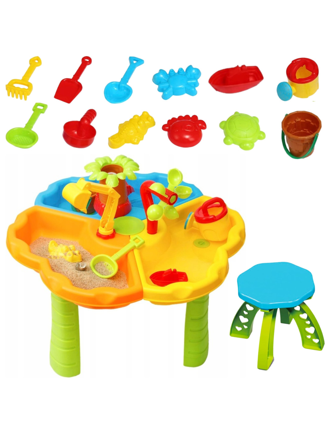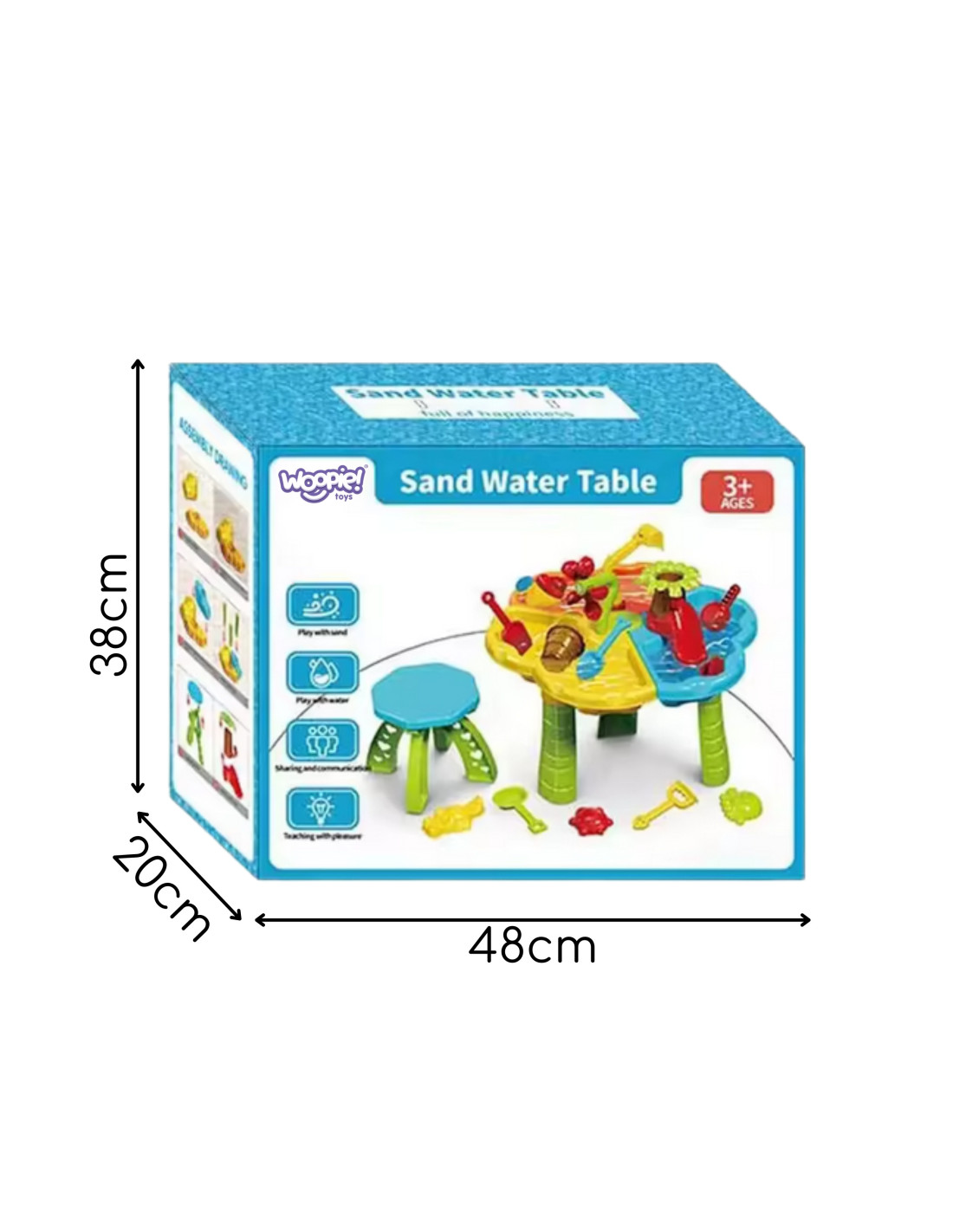 The Woopie 2-in-1 Water Table with Chair is a versatile water and sand play set designed with the needs of the youngest explorers in mind. It's perfect for home, on the balcony, terrace, garden, or beach. This toy develops creativity, imagination, and manual dexterity, providing hours of laughter and learning. Thanks to its extensive features and robust construction, this colorful set is perfect for both the garden and the children's room. Made of safe, durable, and easy-to-clean material with no sharp edges, it's completely safe for toddlers. The table's three-part structure allows children to simultaneously experiment with different structures and materials—sand, water, and the included accessories. Each element of the set is designed to stimulate children's imagination —you'll find a mini-excavator, a tree funnel, a water fan, sand molds, a small boat, shovels, and many other colorful accessories. This allows children to act out scenes, create sand shapes, pour water, build, and experiment – learning through play. The set also includes a colorful and ergonomic chair that ensures comfort while playing. The entire set is easy to assemble and disassemble , making it a perfect solution for both everyday use and travel. The toy requires no tools – everything connects intuitively and stably. The table is not only a place to play but also a learning tool – it supports the development of motor skills, hand-eye coordination, manual dexterity, logical thinking, as well as communication and social skills, especially when playing with peers. It's the perfect toy for shared, joyful moments that simultaneously develop and educate.