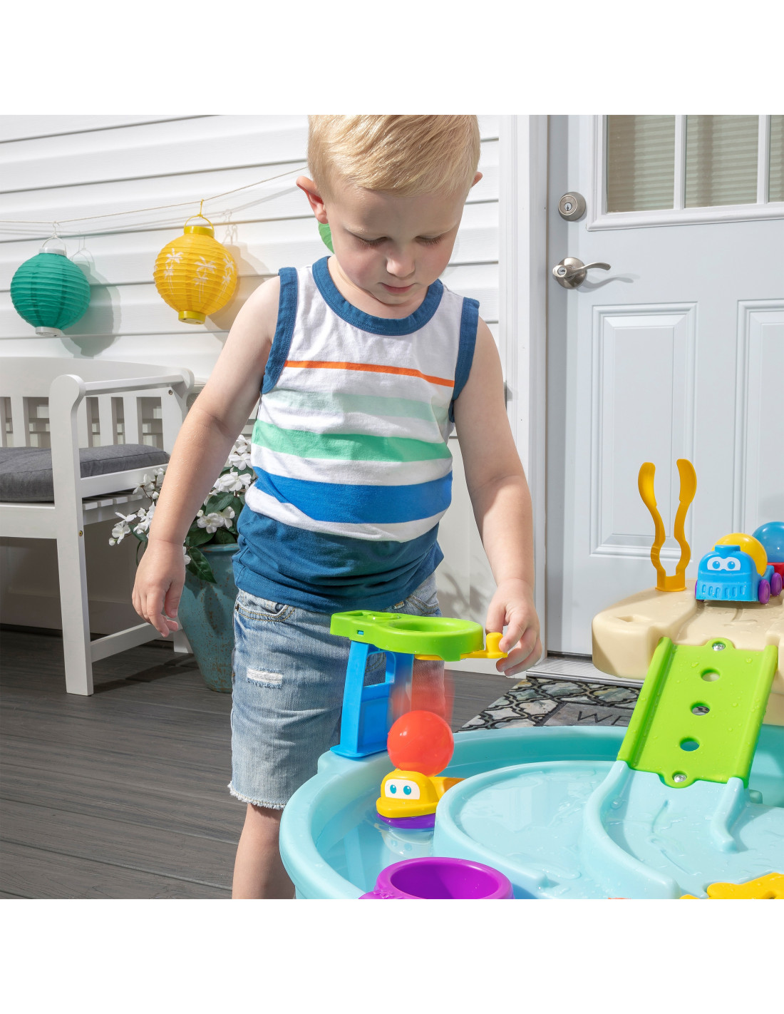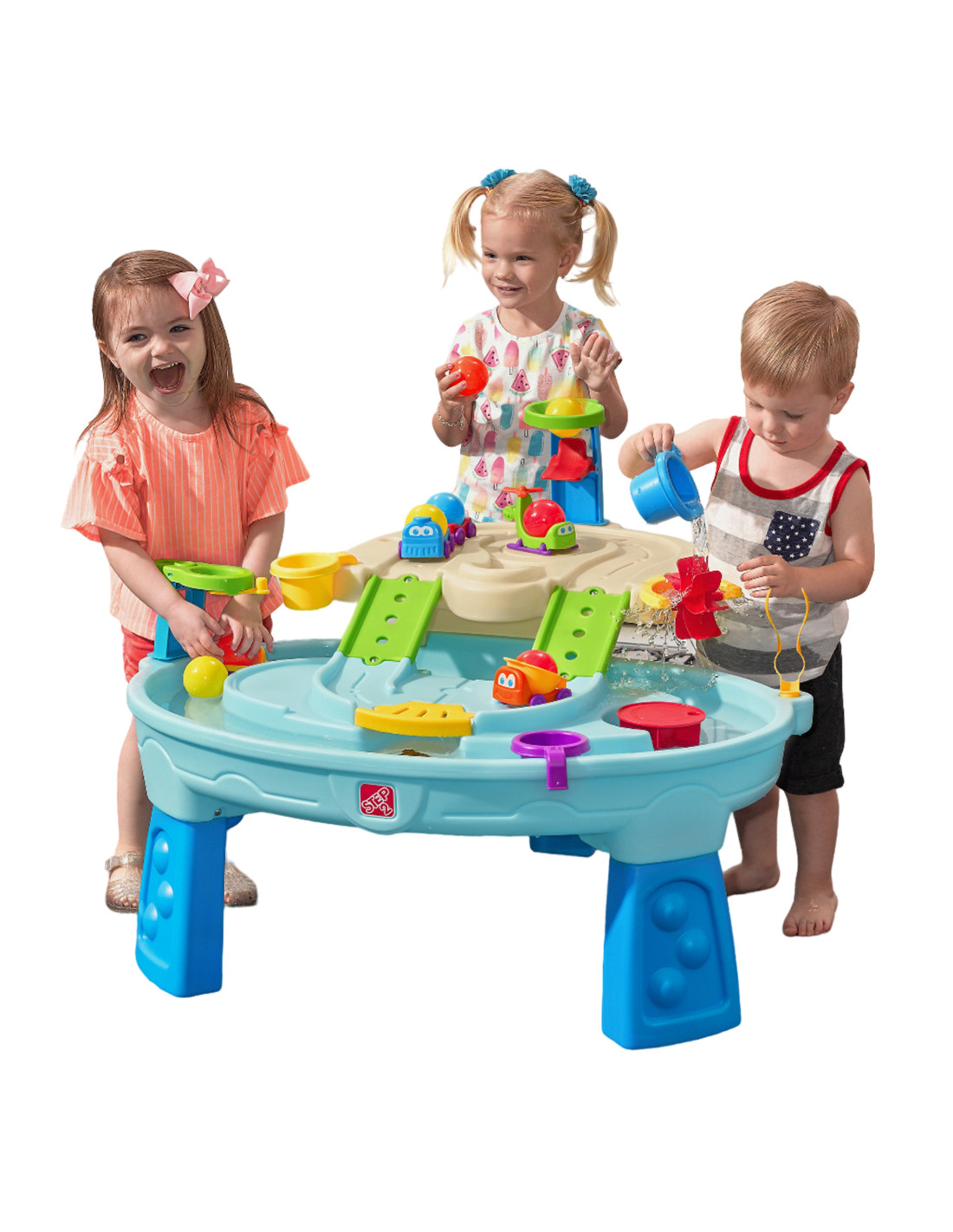 The Step2 Ball Buddies Adventure Center is a two-story kids' water table! In addition to the classic Ball Buddies dump truck , this outdoor play table for kids includes a Ball Buddies helicopter , boat, and train —which can carry two play balls at once! Ball Buddies can't wait to adventure around the river or cruise around the twists and turns of the die-cast roads and bridges. With a large play area, plenty of included accessories, and so many ways to play, this kids' water table is a great way to engage in social play for multiple children. Plus, individual stations around the pool offer additional options for little ones who want to play on their own. Little adventurers can use the hoops to throw balls into the water and enjoy exciting water play with the water wheel and included measuring sticks. There's even an interactive wheel at the bottom so little ones can get the water moving and create a flowing river.