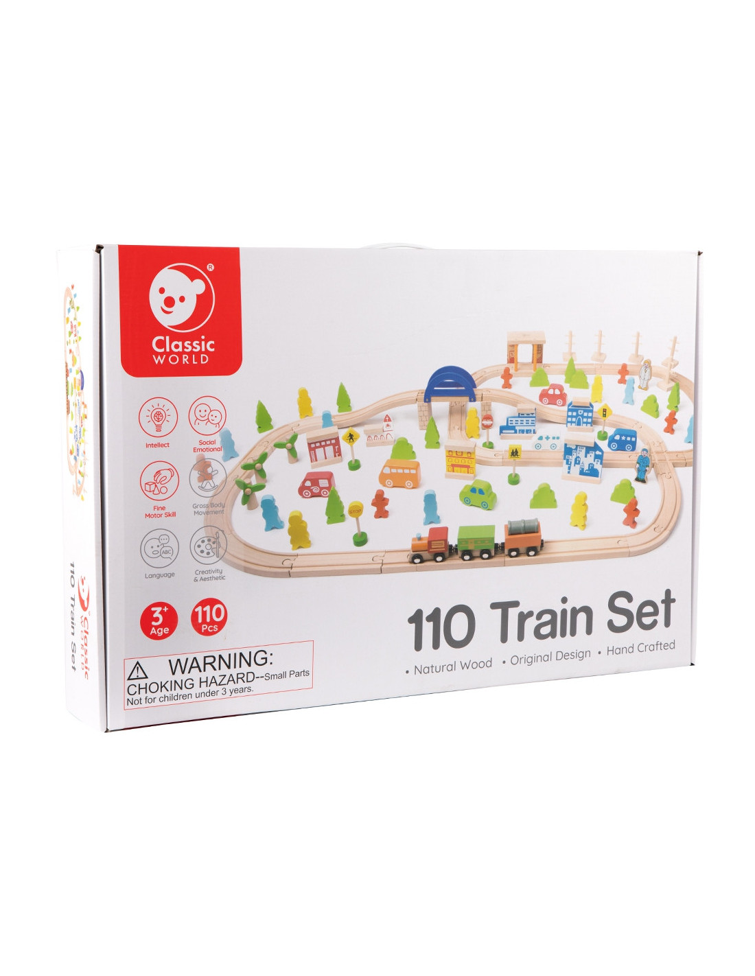 This huge set from Classic World. This 110-piece wooden train set is a great gift for any child who enjoys playing with vehicles and models.