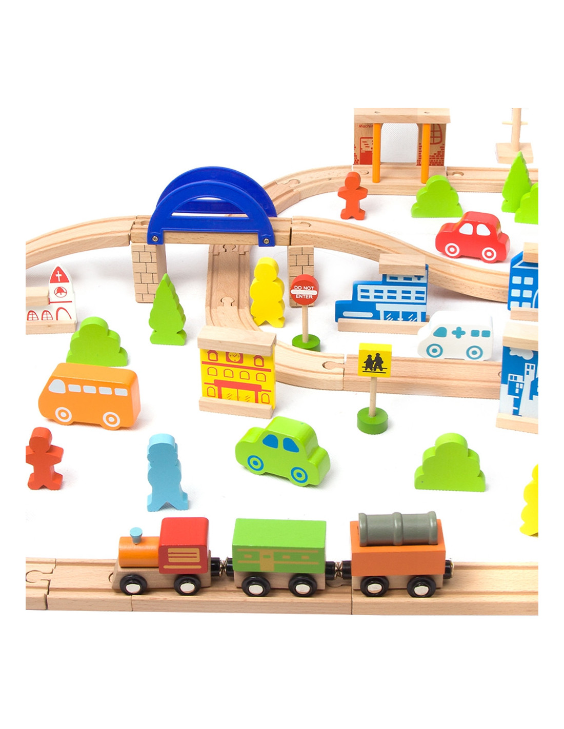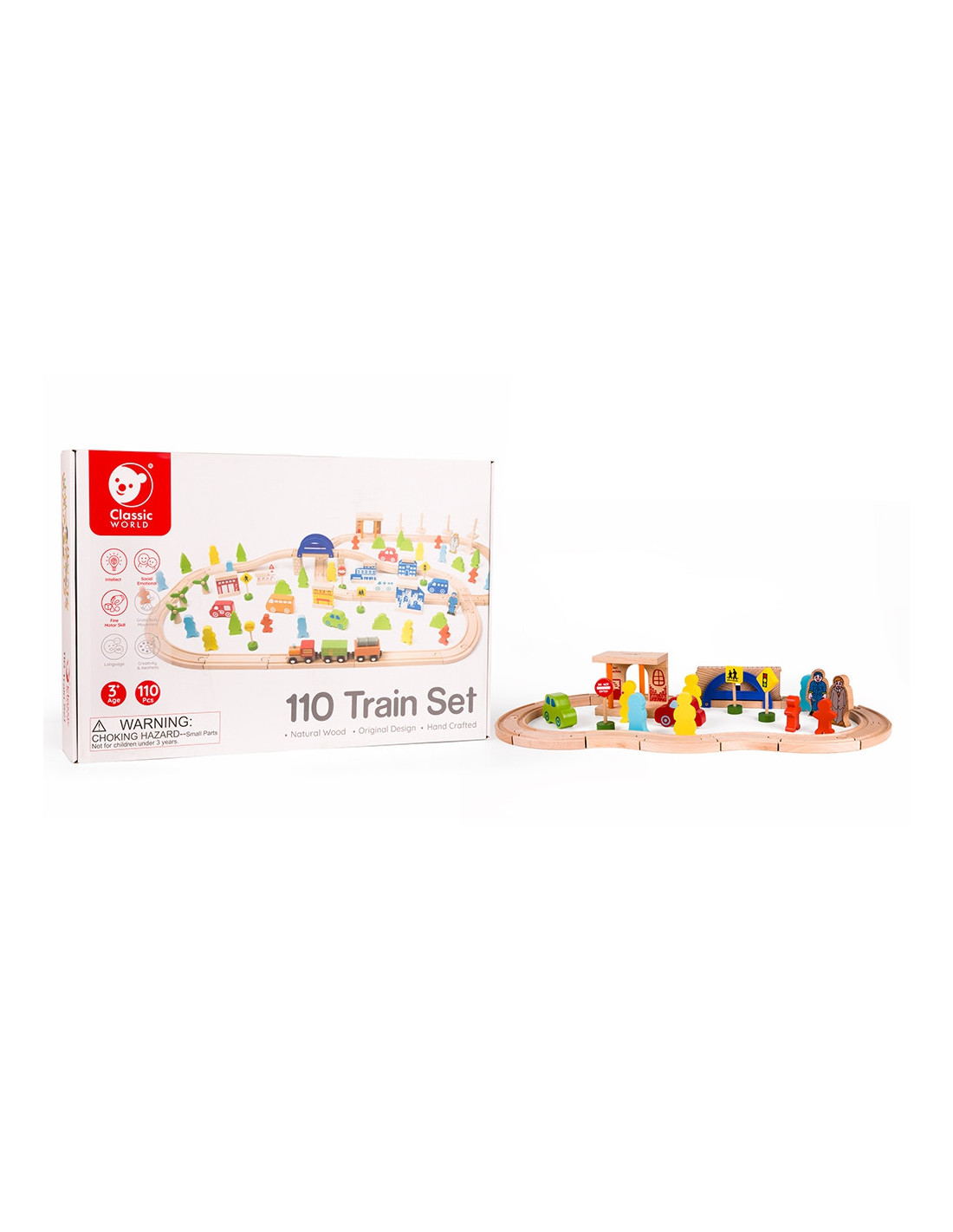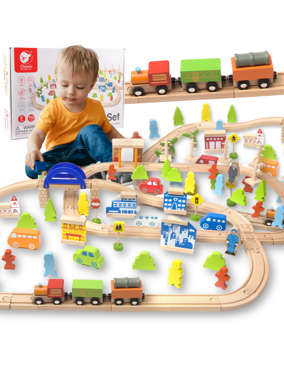 Ogromny zestaw marki Classic World. Drewniana kolejka do złożenia ze 110 elementów to wspaniały prezent dla każdego dziecka, który lubi zabawę pojazdami, oraz makietami.