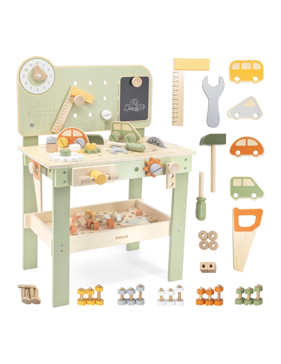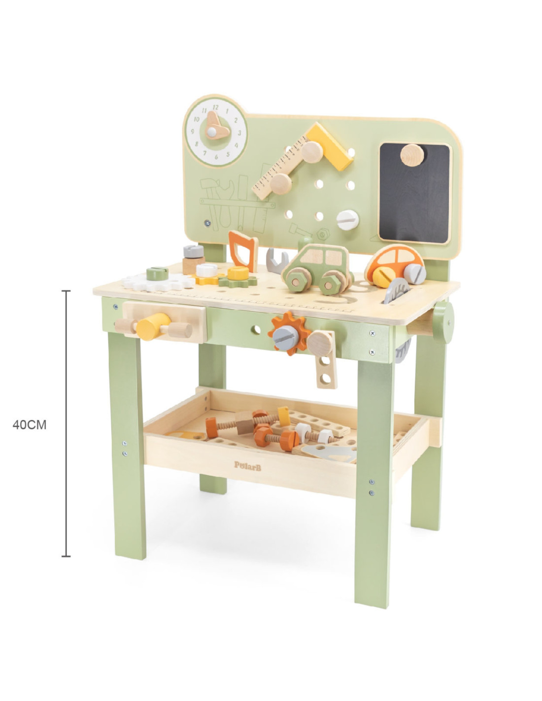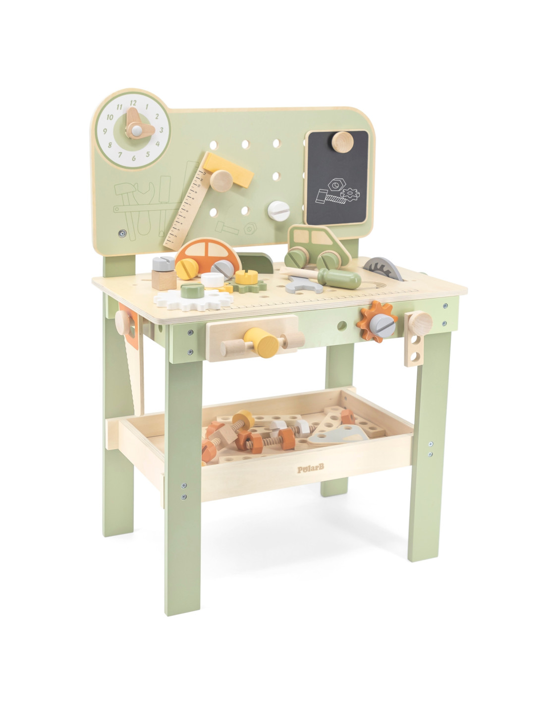 Warsztat majsterkowicza od marki Viga Toys z ekskluzywnej serii PolarB pozwoli poczuć się Twojemu dziecku jak prawdziwy mechanik. Dziecko może wbijać gwoździe, dokręcać śruby kluczem, a także przykręcać drewniane deski i zębatki do stołu warsztatowego. Zabawka posiada zegar ze wskazówkami, drewniane samochodziki oraz różne narzędzia.