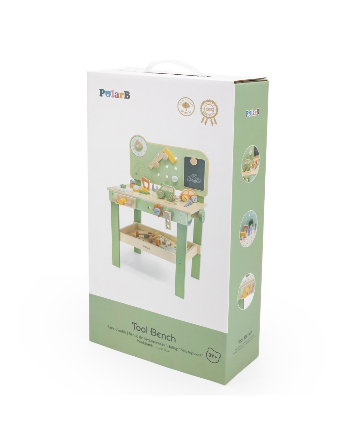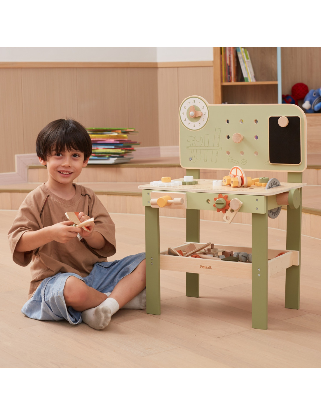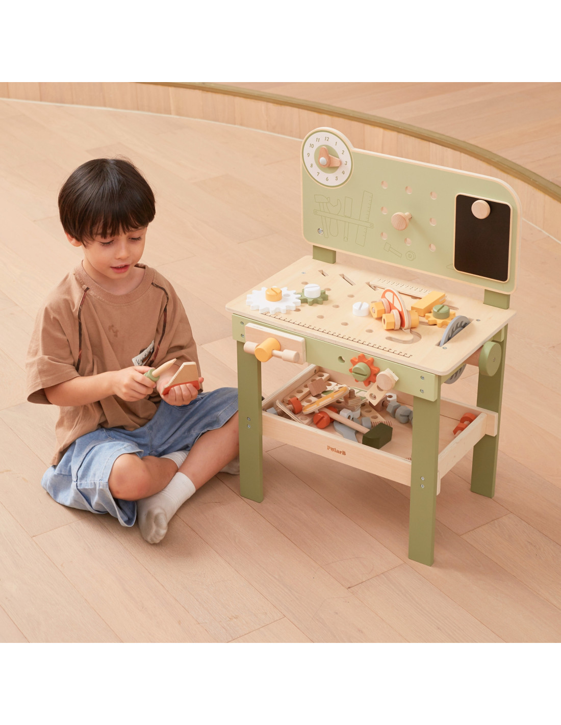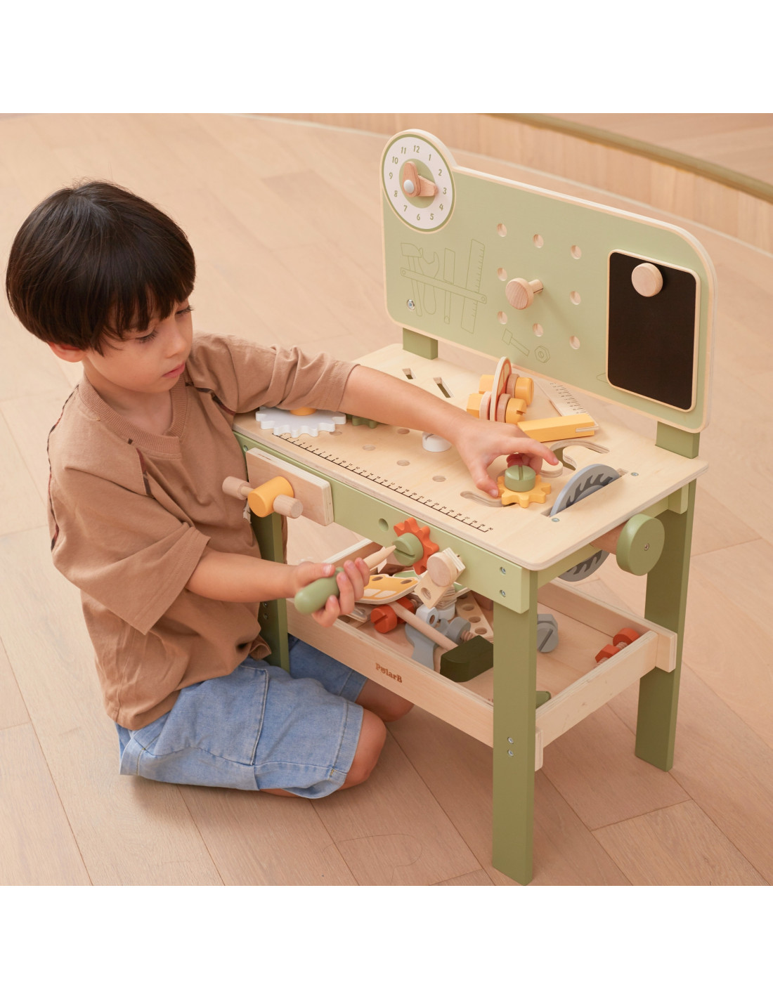 Warsztat majsterkowicza od marki Viga Toys z ekskluzywnej serii PolarB pozwoli poczuć się Twojemu dziecku jak prawdziwy mechanik. Dziecko może wbijać gwoździe, dokręcać śruby kluczem, a także przykręcać drewniane deski i zębatki do stołu warsztatowego. Zabawka posiada zegar ze wskazówkami, drewniane samochodziki oraz różne narzędzia.