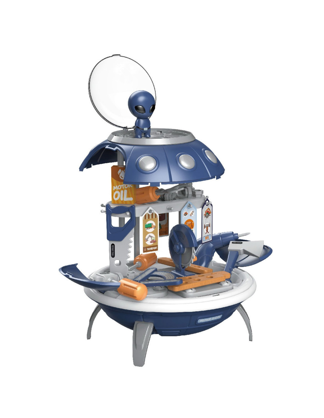 Warsztat UFO od marki WOOPIE to kosmiczny zestaw dla każdego dziecka! Zabawka posiada 3 funkcje. Można włączyć projektor i uczyć się nazw planet. Można użyć go jako stylowy plecak z marsjaninem. Podczas noszenia plecaka głowa marsjanina swobodnie porusza się za szybką statku. Jednak najważniejsza funkcją jest możliwość rozłożenia statku kosmicznego w super warsztat. Dziecko może wcielić się w majsterkowicza na marsie i bawić się wspólnie z przyjaciółmi. Zestaw zawiera aż 52 elementy: wszystkie potrzebne rzeczy, które posiada każdy warsztat. Funkcja plecaka pozwoli zabrać wszędzie swój własny, przenośny warsztat. Odgrywanie ról i naśladowanie zawodów rozwija świadomość Twojego dziecka oraz pobudza wyobraźnie i kreatywność.
