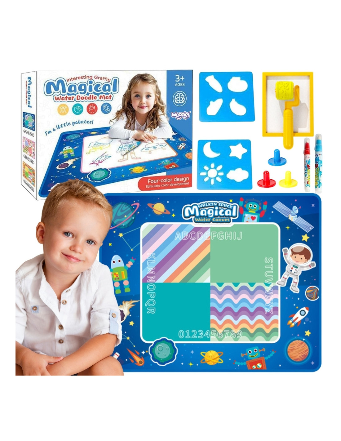 Mata wodna marki Woopie to innowacyjna zabawka edukacyjna, która umożliwia dzieciom tworzenie rysunków wyłącznie za pomocą wody – bez zabrudzeń i ryzyka poplamienia. Po kilku minutach rysunki stopniowo znikają, dając dziecku możliwość tworzenia nowych dzieł bez końca. Duża powierzchnia do malowania i bogaty zestaw akcesoriów zapewniają godziny bezpiecznej, kreatywnej zabawy w domu lub przedszkolu. Kosmiczny motyw maty z planetami, robotami, rakietami i astronautami zamieniają zwykłe rysowanie w podróż po galaktyce pobudzając wyobraźnię twojego dziecka. Mata poprawia zdolności manualne, koordynację ręka-oko i jest świetnym sposobem na naukę przez zabawę. Można z niej korzystać zarówno w domu jak i w ogrodzie.