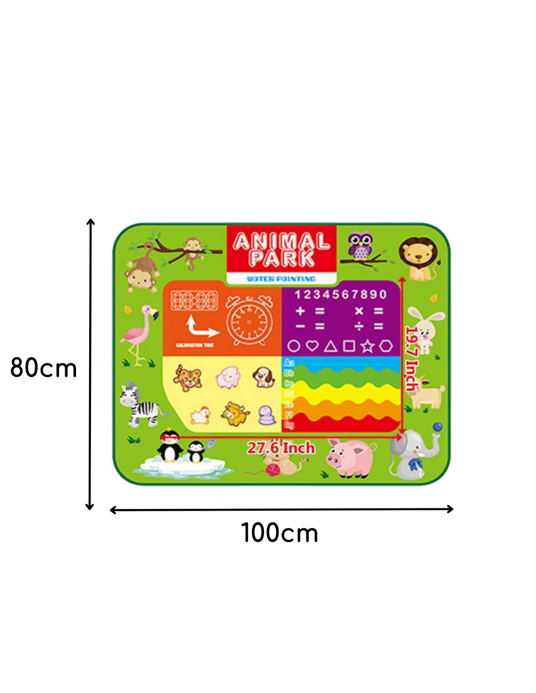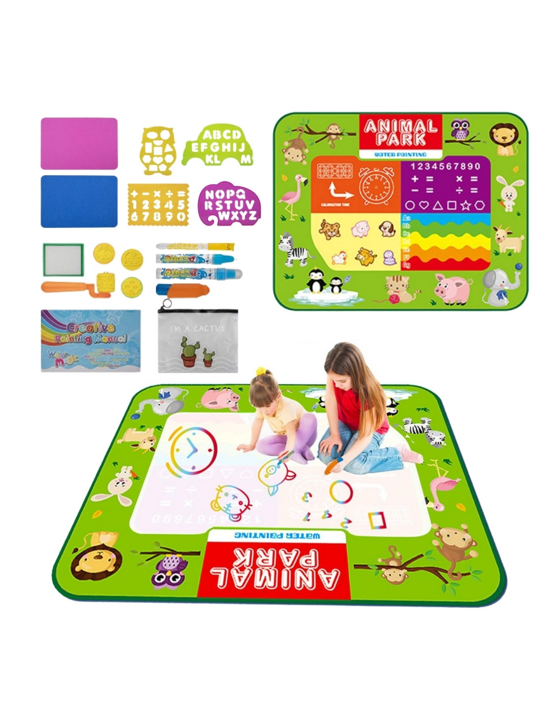Oto niezwykła edukacyjna mata wodna Animal Park marki Woopie – kolorowa, bezpieczna i pełna przygód przestrzeń stworzona z myślą o najmłodszych odkrywcach! Dzięki zestawowi dziecko uczy się poprzez zabawę – poznaje alfabet, cyfry, kształty, zegar analogiczny, zwierzęta. Na późniejszym etapie można się uczyć również w języku angielskim. Dołączone akcesoria, takie jak pisaki wodne, wałek, stemple i szablony, pozwalają malować bez plam i bałaganu – wystarczy woda! Produkt jest wielokrotnego użytku – po wyschnięciu mata jest gotowa do kolejnych kreatywnych sesji po kilku minutach. Idealna do zabawy solo lub z rodzeństwem, przyjaciółmi czy rodzicami. Mata poprawia zdolności manualne, koordynację ręka-oko i jest świetnym sposobem na naukę przez zabawę. Można z niej korzystać zarówno w domu jak i w ogrodzie.