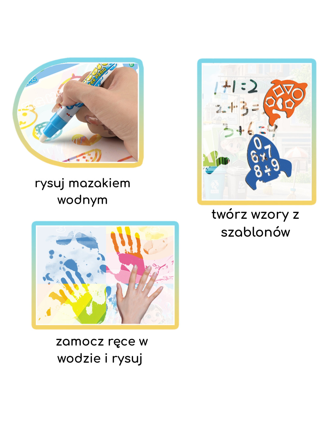 Ta magiczna, duża mata wodna od marki Woopie to idealny sposób na kreatywną zabawę bez bałaganu. Wystarczy napełnić pisaki wodą, a kolory zaczną pojawiać się na macie jak za dotknięciem czarodziejskiej różdżki! Gdy mata wyschnie, rysunek znika, dzięki czemu zabawę można zacząć od nowa. To wspaniałe rozwiązanie, które pozwala dziecku rozwijać zdolności artystyczne bez ryzyka zabrudzenia ubrań, mebli czy ścian. Mata z motywem dinozaurów i zamku wprowadzi malucha do fantastycznego świata rysowania. W zestawie znajdują się różnorodne akcesoria, takie jak pisaki, które można wykorzystać do malowania, oraz gąbkowe stemple, które pozwalają na tworzenie dodatkowych kształtów. Duży rozmiar maty zachęca do wspólnej zabawy z rodzeństwem lub rodzicami. Produkt jest bezpieczny i wielorazowego użytku.