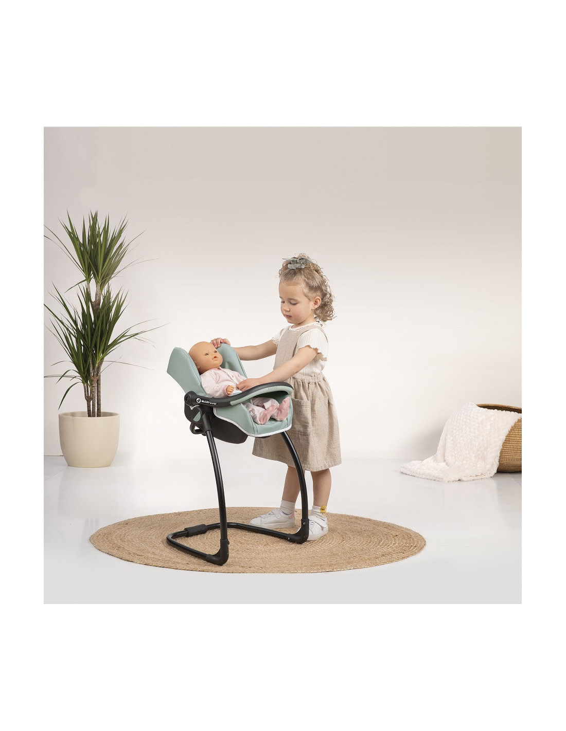 Ten śliczny zestaw dla lalek stylizowany jest na kolekcji Maxi Cosi Quinny o nowoczesnej stylistyce. Krzesełko ze stolikiem jest niezwykle stabilne, a po nakarmieniu lalki można je zmienić w prosty sposób na nosidełko lub bujak/huśtawkę. Zestaw przeznaczony dla lalek 42 cm.