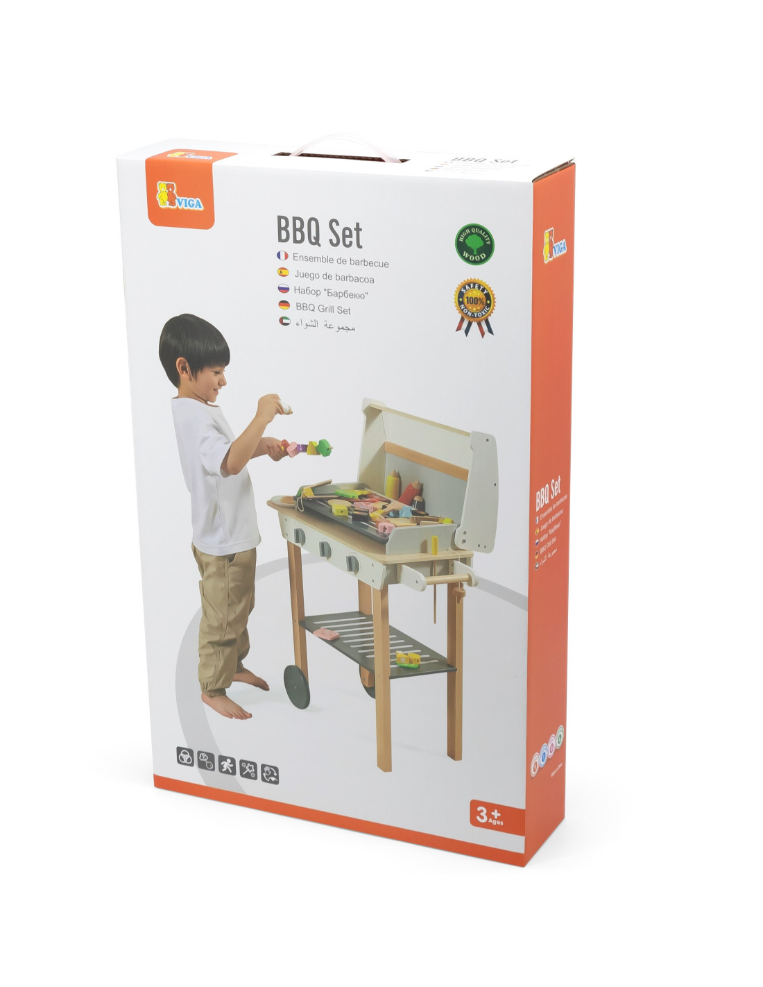 Drewniany Grill Barbecue od marki VIGA jest jak prawdziwy grill! Zestaw zawiera 47 akcesoriów, takich jak słoiki z przyprawami, keczup, musztardę, szczypce, sztućce itp. Realistyczności dodają efekty dźwiękowe. Dzieci mogą tworzyć szaszłyki, kanapki, burgery. Zdejmowana pokrywa pozwala zabezpieczyć "gorący" ruszt po grillowaniu, a kółeczka i wygodny uchwyt pozwalają przewozić grill w dowolne miejsce ogrodu lub domu. Dziecko będzie mogło wcielić się w rolę dorosłego, który pilnuje rodzinnego grilla.