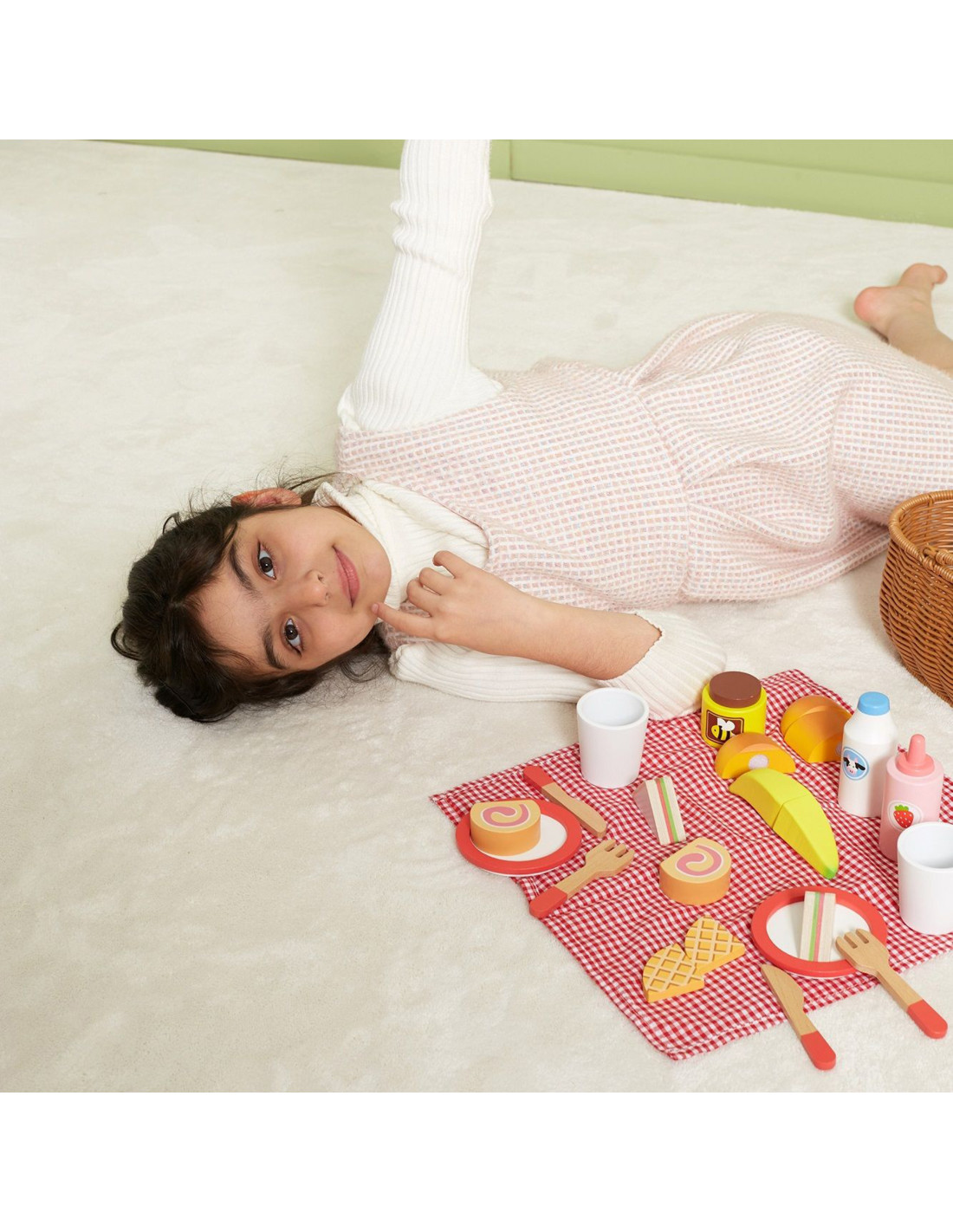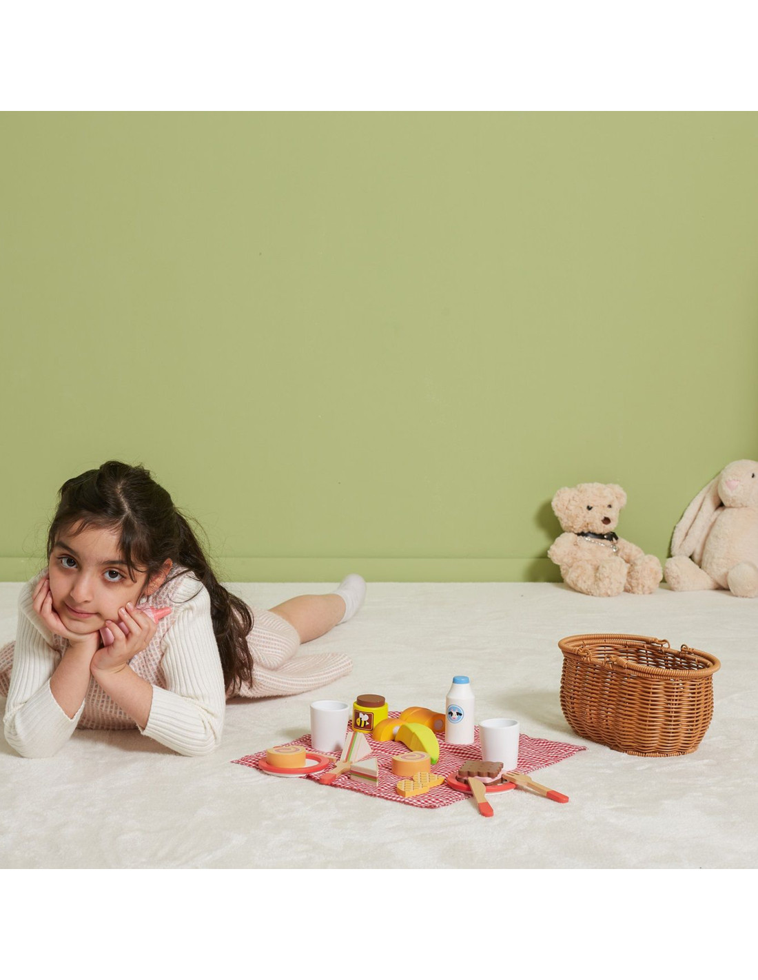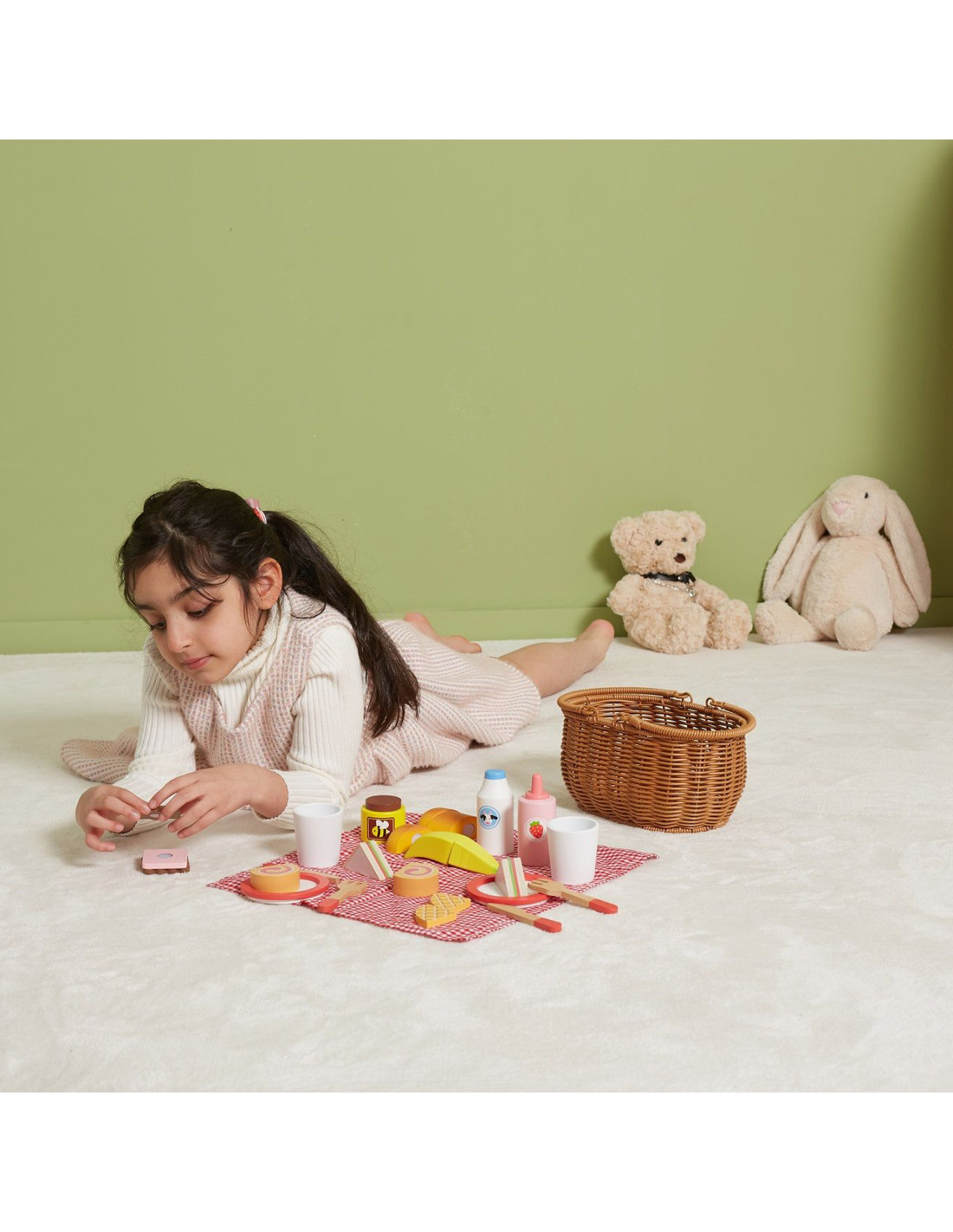 Wybierz się z przyjaciółmi na wesoły piknik z Drewnianym Zestawem Piknikowym od marki VIGA. Piękny koszyk wykonany ze sztucznej trzciny wypełniony jest drewnianym zestawem akcesoriów i tkaniną w kratę. Dzięki solidnym uchwytom Twoje dziecko z łatwością zabierze ze sobą cały zestaw, gdziekolwiek się uda. Zawarte w komplecie drewniane przekąski i akcesoria pozwolą na zabranie na piknik swoje ulubione zabawki, maskotki czy też odegranie scenki ze swoim przyjacielem. Zabawa z tym zestawem jest możliwa na świeżym powietrzu, jak i w domowym zaciszu. Część potraw składa się z kilku części i przymocowane są za pomocą rzepów. Za pomocą drewniane noża maluch może kroić je na kawałki, dzięki czemu rozwinie swoje zdolności motoryczne. Naśladowanie dorosłych przyczyni się za to do rozwoju umiejętności społecznych.