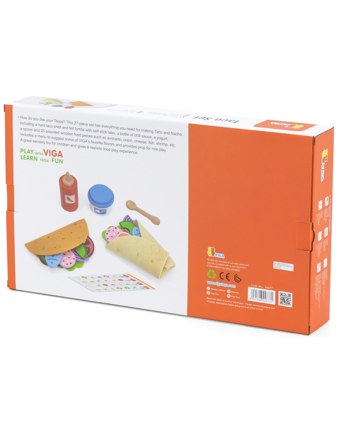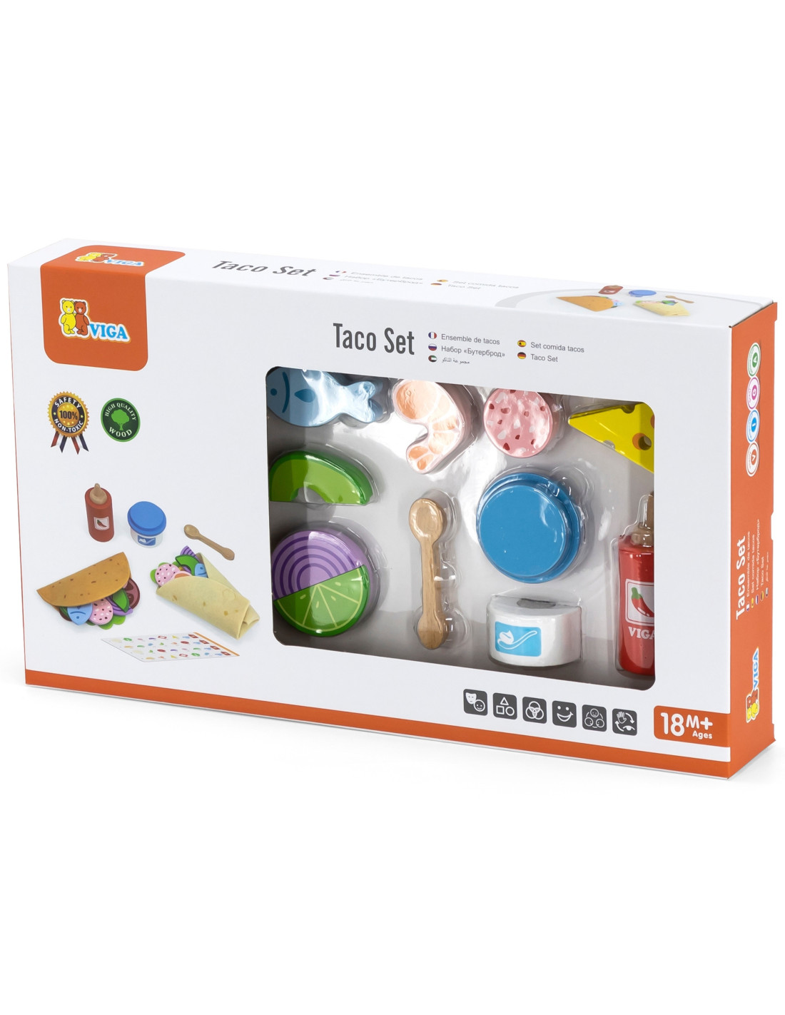 VIGA Zestaw Meksykańskich Potraw Taco i Burrito to zestaw 27 elementów dla małych kucharzy, którzy chcą przygotować swoje własne pyszne taco i burrito! Zabawka zapewnia realistyczną zabawę w gotowanie, rozwija wyobraźnię i umiejętności manualne, a także uczy dzieci rozpoznawania składników i tworzenia kulinarnych kompozycji.