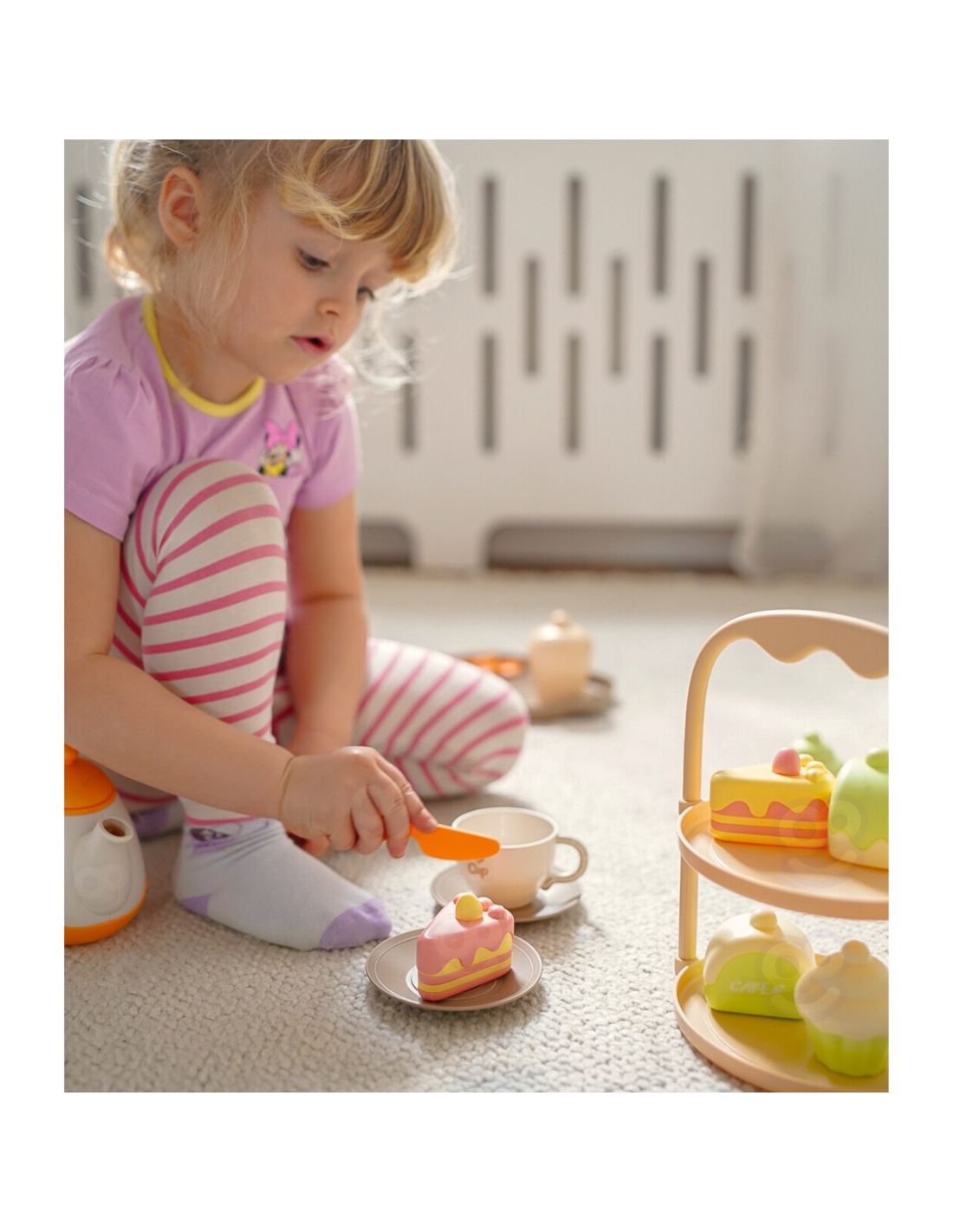 Drewniany zestaw do herbaty i deserów sprawi, że dziecko będzie mogło przyjmować gości i serwować herbatę oraz desery całej rodzinie. Nauczy dobrych manier i umiejętności dzielenia się z innymi podczas zabawy.