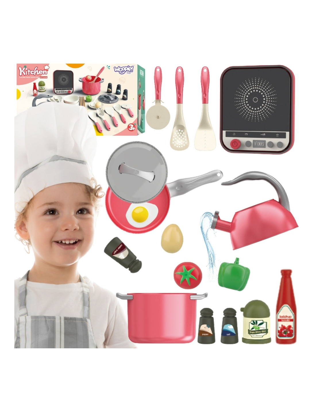 WOOPIE Zestaw Małego Kucharza Indukcja Garnki Patelnia Czajnik Różowy 30el.