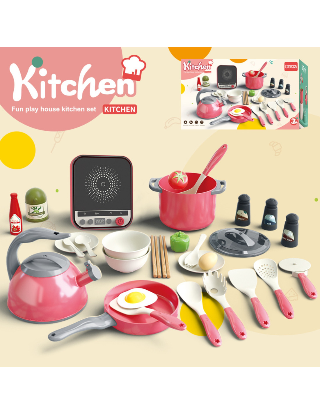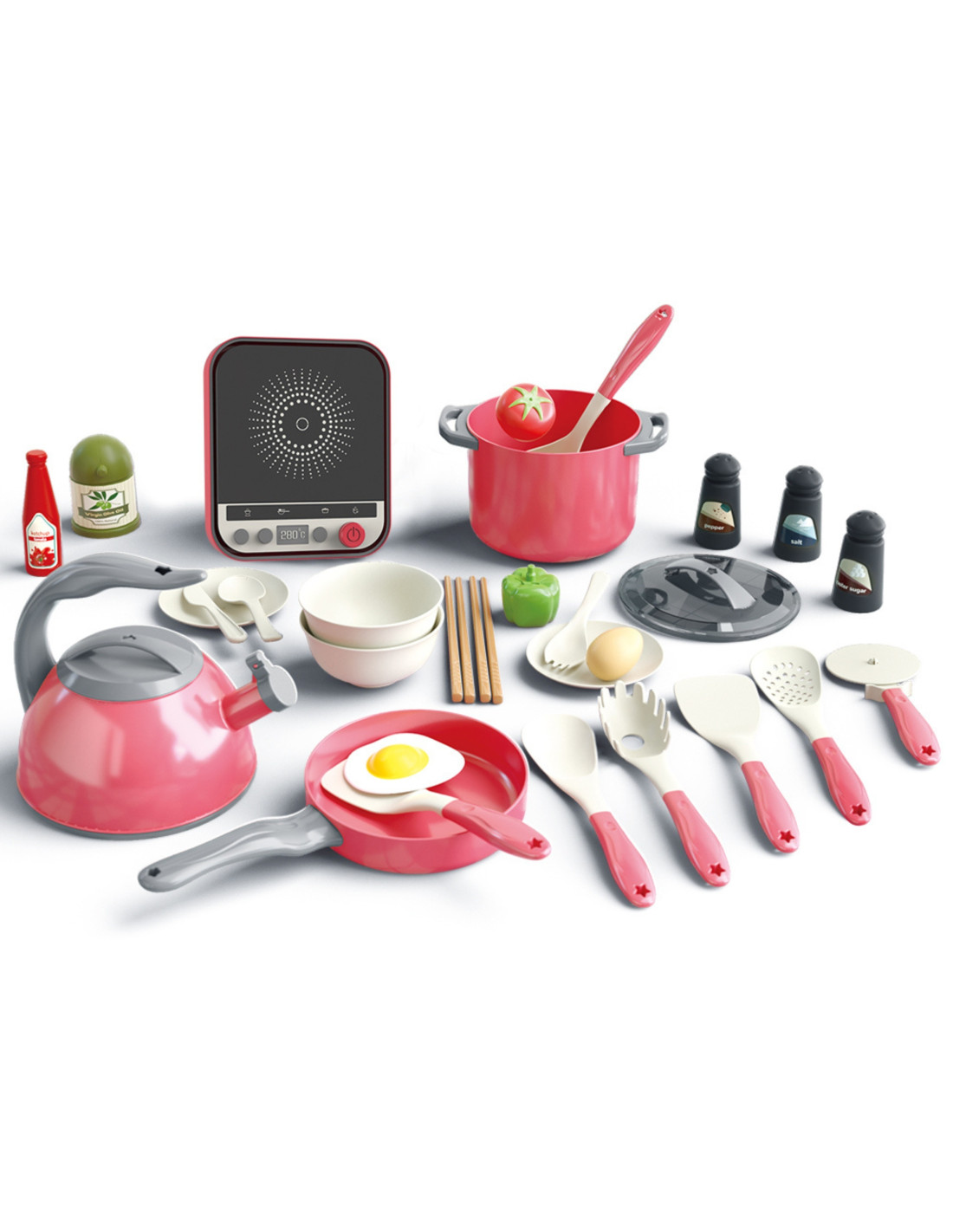- - Realistyczne akcesoria, takie jak jajko, pomidor i przyprawy.