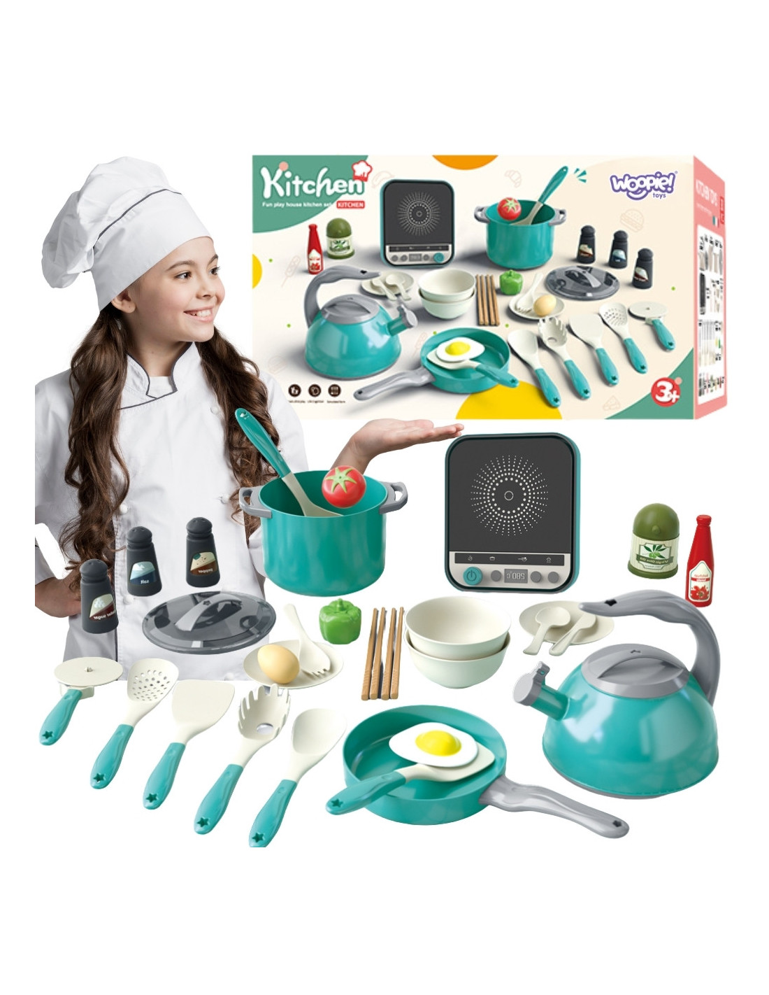 Ten obszerny zestaw do zabawy w kuchnię od marki Woopie to idealny prezent dla każdego małego kucharza! Zabawka pozwala dzieciom na naśladowanie dorosłych i odgrywanie ról, rozwijając ich kreatywność, wyobraźnię oraz zdolności manualne. Zestaw zawiera wszystko, czego potrzeba do przygotowania wymarzonego posiłku.W skład zestawu wchodzi aż 30 elementów, w tym garnki, patelnia z jajkiem sadzonym, czajnik, a nawet indukcyjna płyta grzewcza. Dodatkowe akcesoria, takie jak sztućce, warzywa, i przyprawy sprawiają, że zabawa staje się niezwykle realistyczna i wciągająca. To doskonały sposób na naukę przez zabawę, rozwijanie zdolności społecznych i spędzanie czasu z rodzicami.