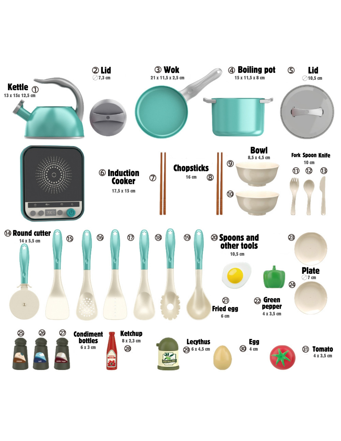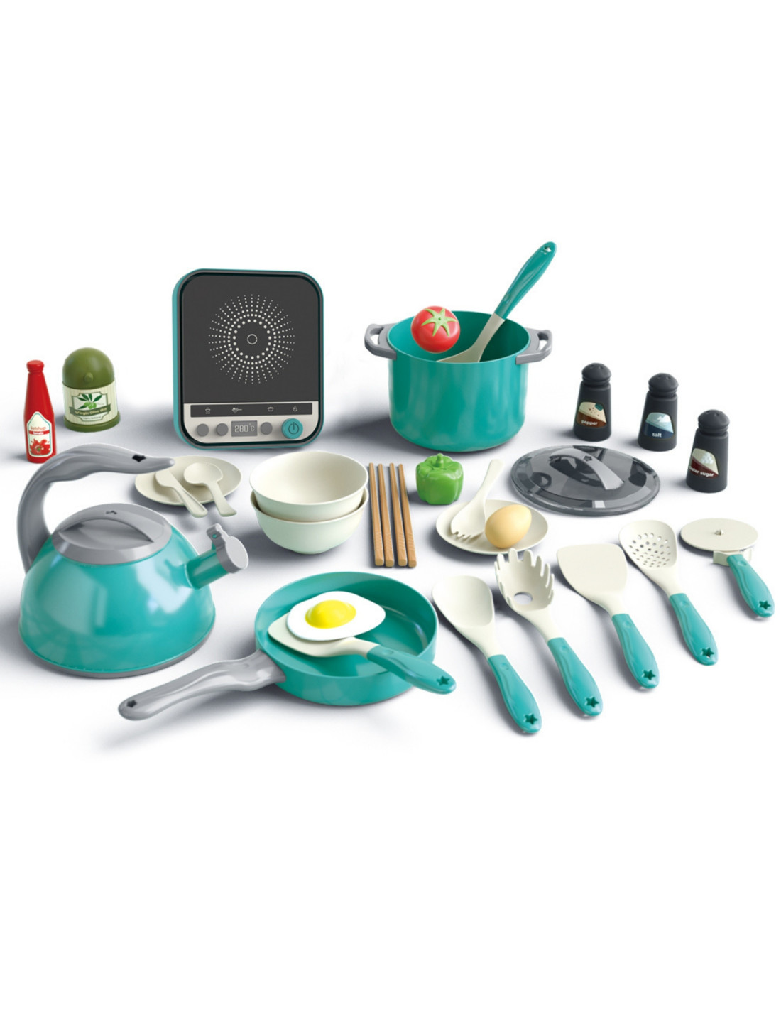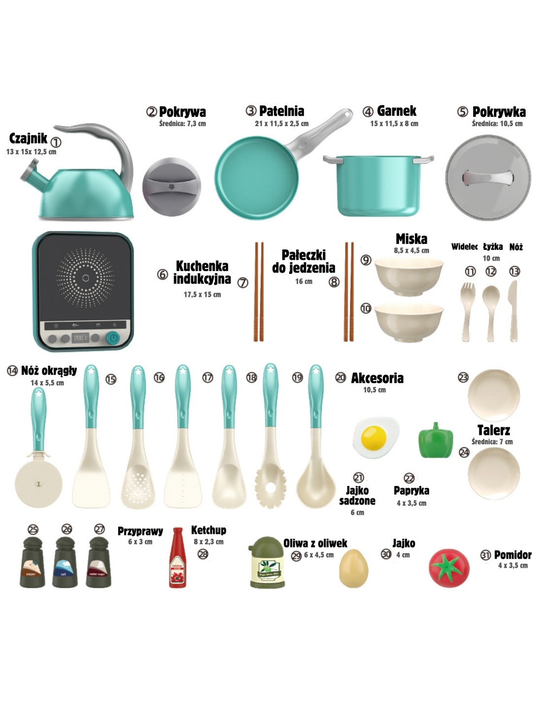 - - Realistyczne akcesoria, takie jak jajko, pomidor i przyprawy.