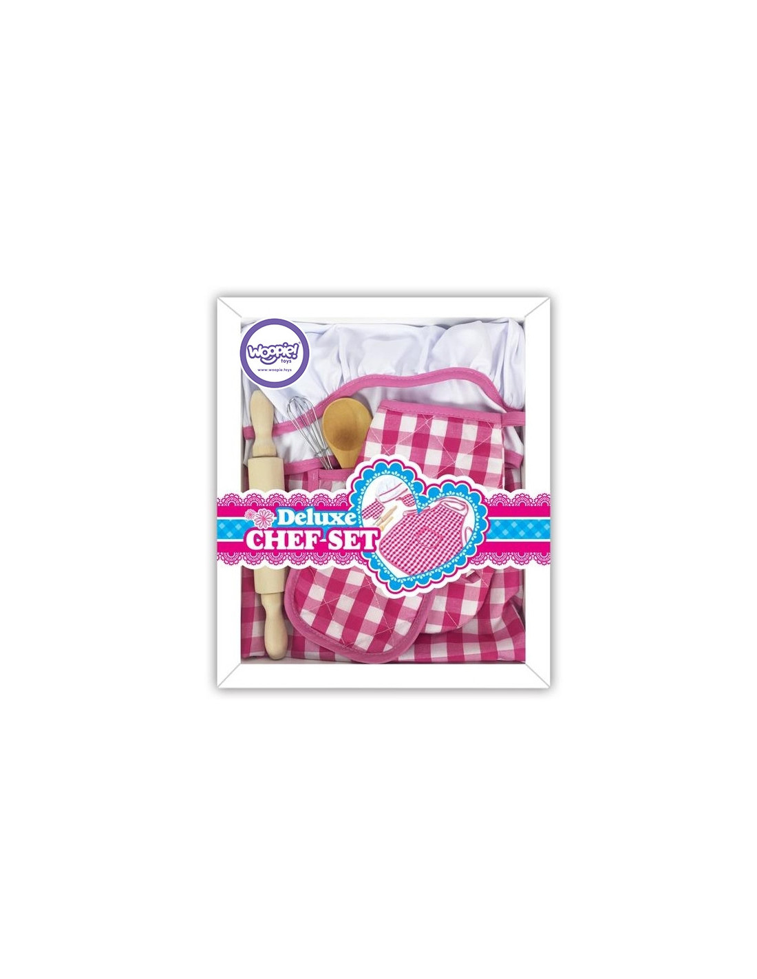 WOOPIE Zestaw Kucharza Strój Kucharski z Akcesoriami to idealny produkt dla każdego małego szefa kuchni. Ślicznie zapakowany świetnie sprawdzi się jako prezent dla małego kucharza. W skład zestawu wchodzi: fartuszek, czapka, rękawica kuchenna, podkładka materiałowa, wałek do ciasta o długości około 20 cm, drewniana łyżka oraz metalowa ubijaczka. Każdy maluch lubi pomagać w pracach kuchennych, dzięki temu zestawowi zostanie idealnie wyposażony w niezbędne akcesoria!