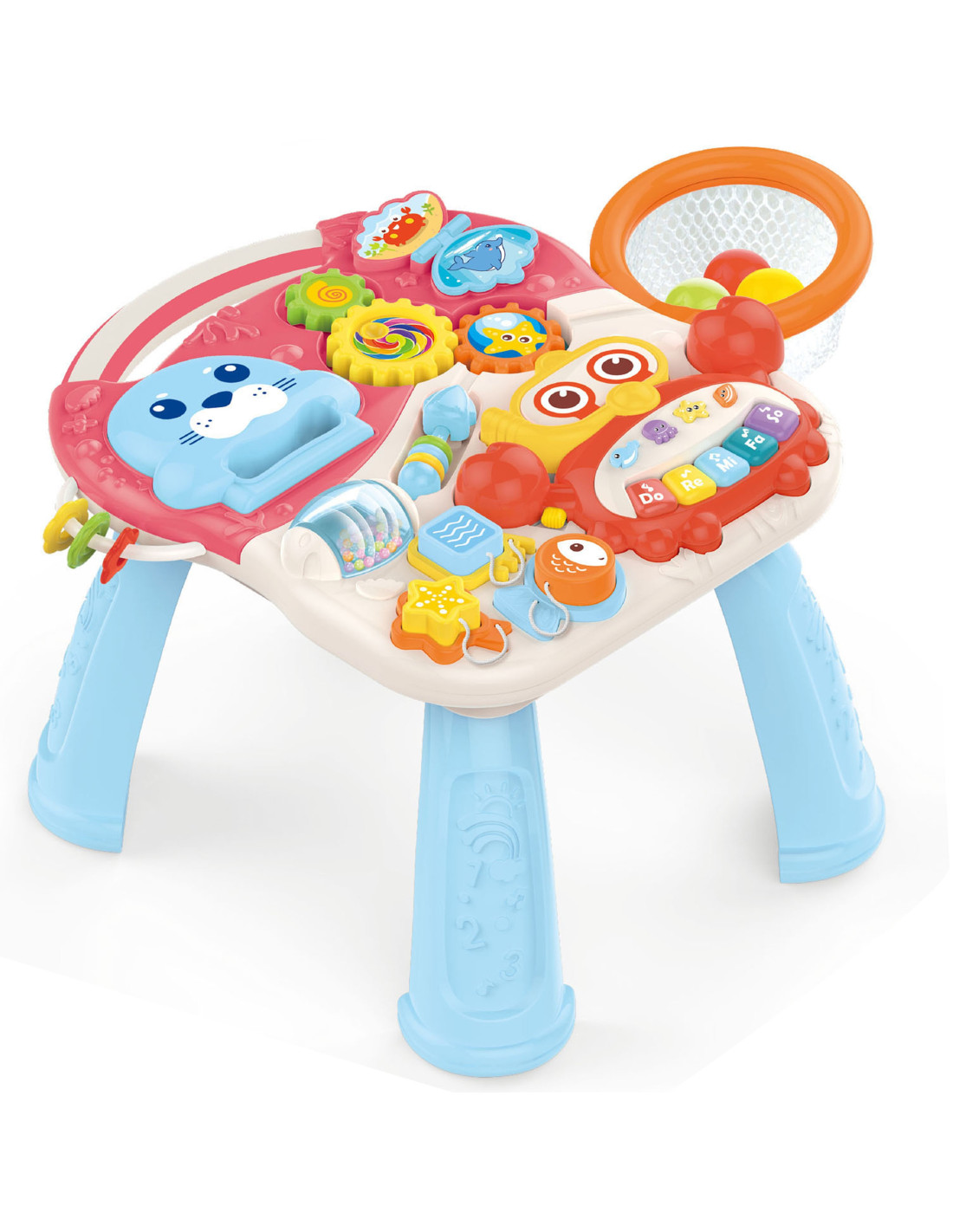 Główny panel oferuje mnóstwo atrakcji: krabik-mini-organki dla rozwoju muzycznego, ruchome "drzwiczki" z wesołymi zwierzątkami, obrotowe zębatki, kolorowe klocki na sznurkach do nauki kształtów i kolorów, obrotową grzechotkę, mini liczydło z krążkami i wiele innych.