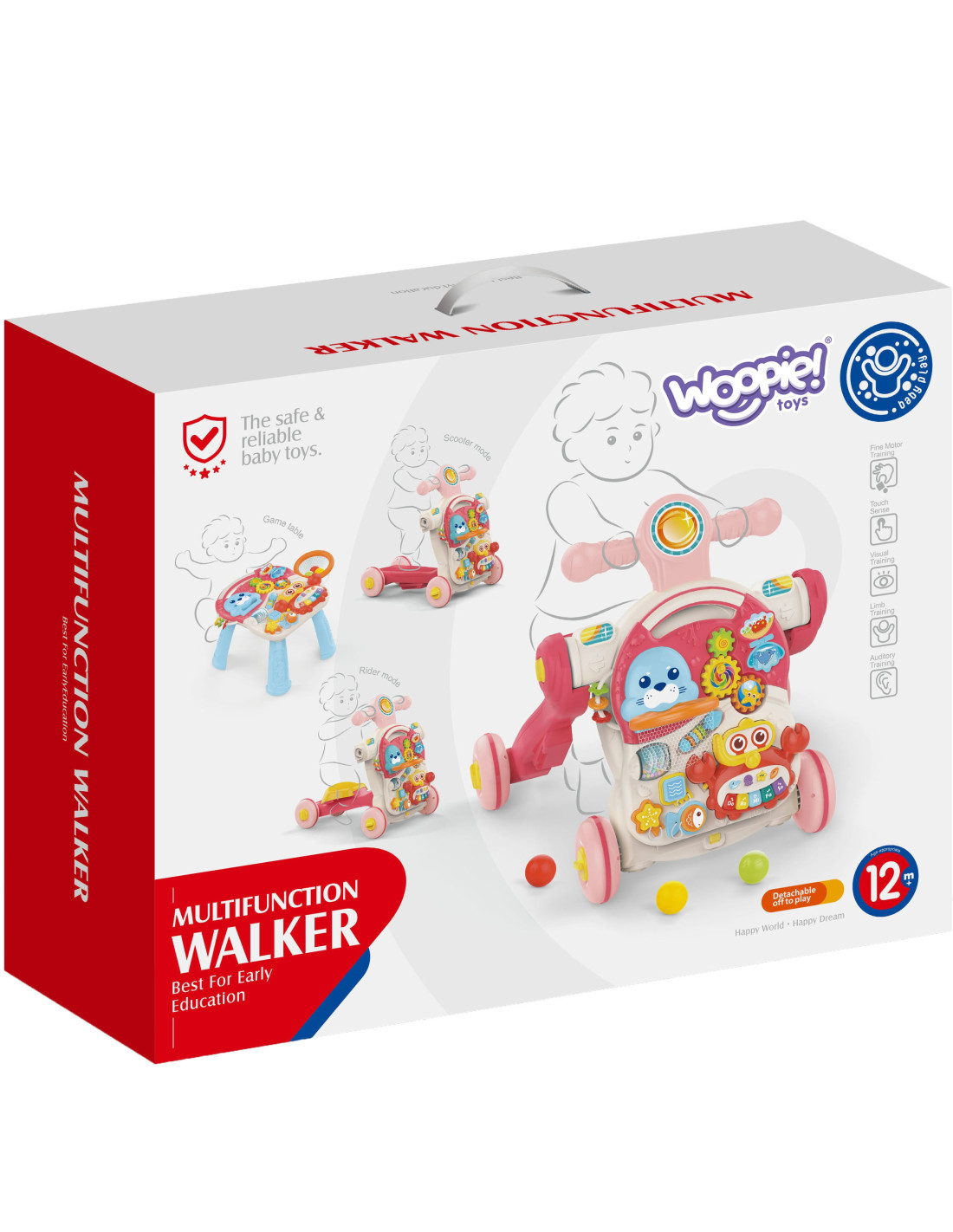 Odkryj nieskończone możliwości zabawy z Wielofunkcyjnym Interaktywnym Jeździkiem 4w1 od marki WOOPIE! Ten edukacyjny pchacz stanie się ulubionym towarzyszem Twojego malucha, podążając za nim krok w krok od pierwszych raczkujących dni, aż do swobodnego przemieszczania.