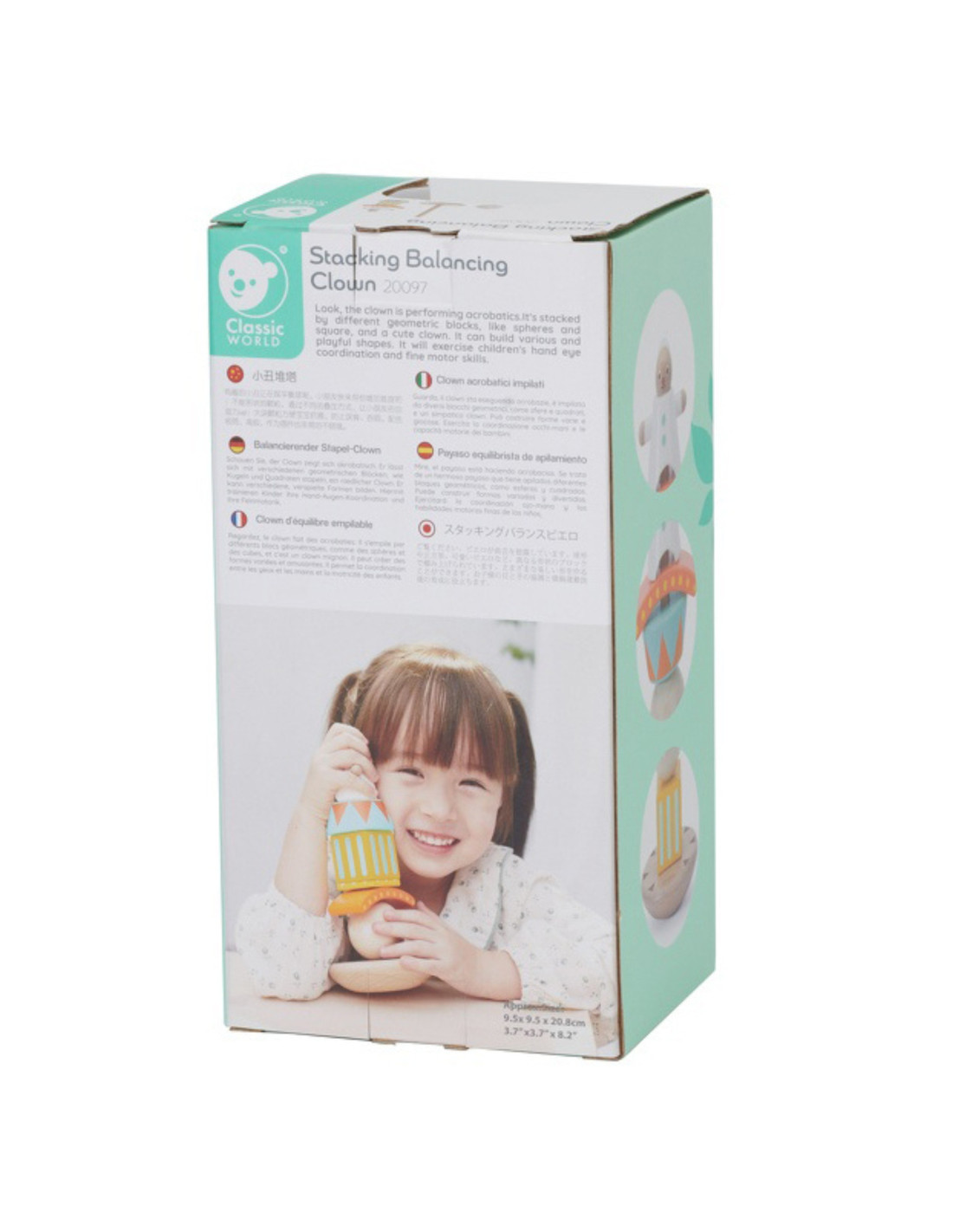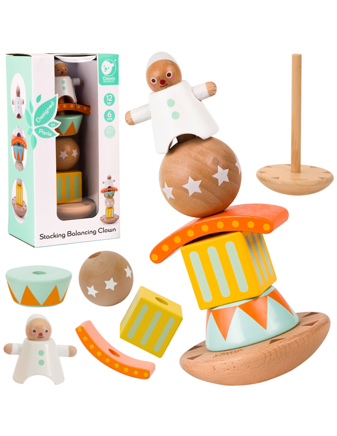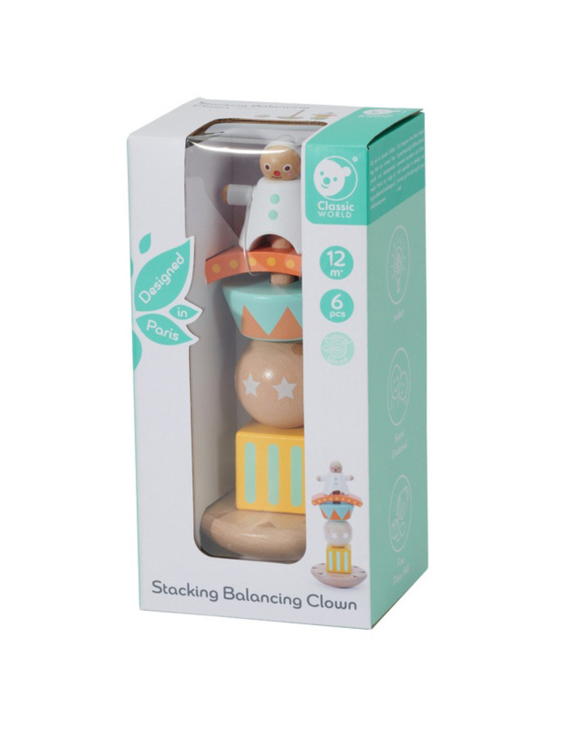 CLASSIC WORLD Drewniany Balansujący Klaun to piękna, pastelowa drewniana zabawka do układania, zaprojektowana, aby bawić maluchy, jednocześnie je ucząc. Zabawa polega na ułożeniu na paliku odpowiednio klocków tak, by klaun był na górze. Daje godziny zabawy dla jednej osoby lub całej rodziny. Gra pomaga maluchom rozwijać umiejętności koordynacji wzrokowo-ruchowej i rozpoznawania kolorów.