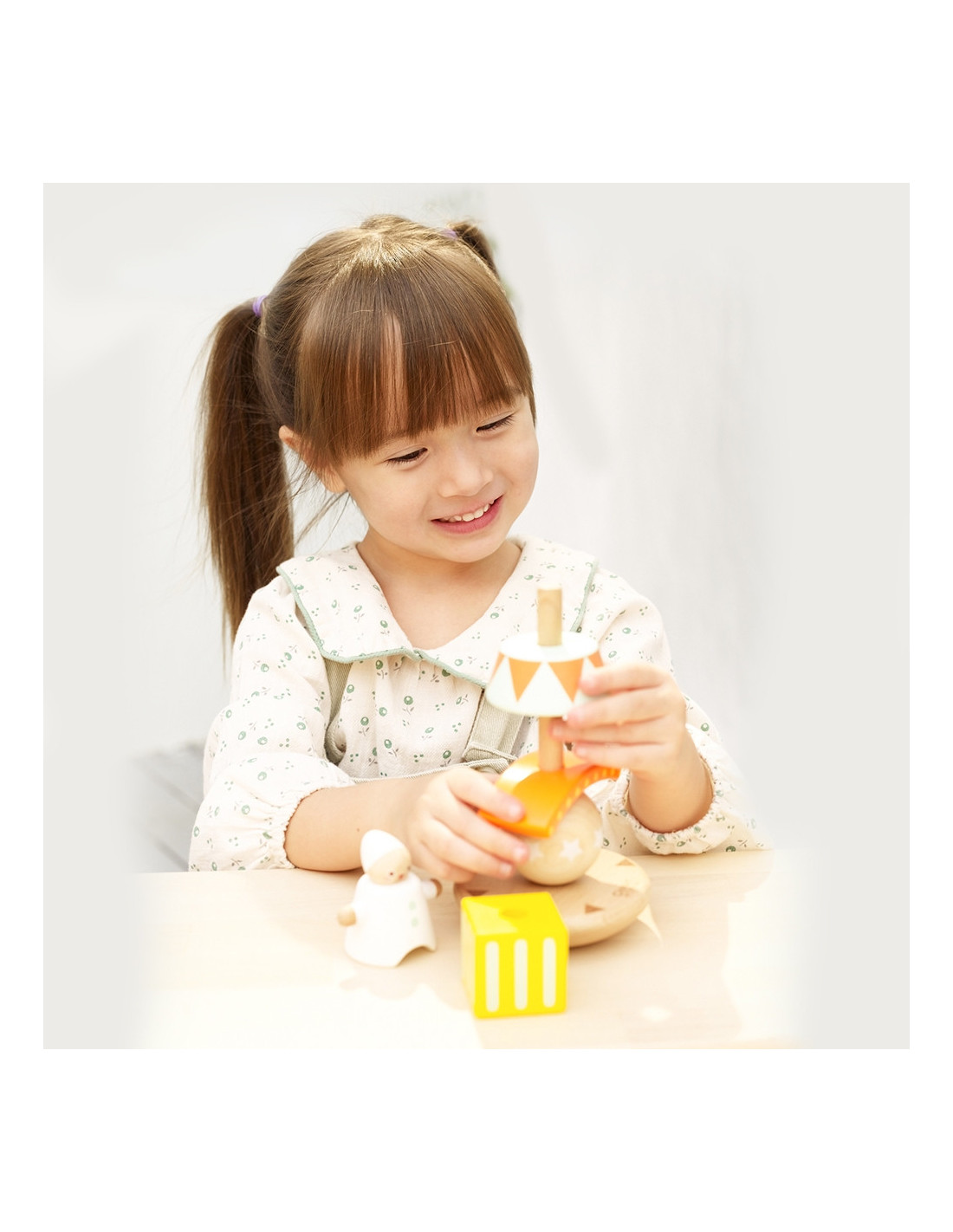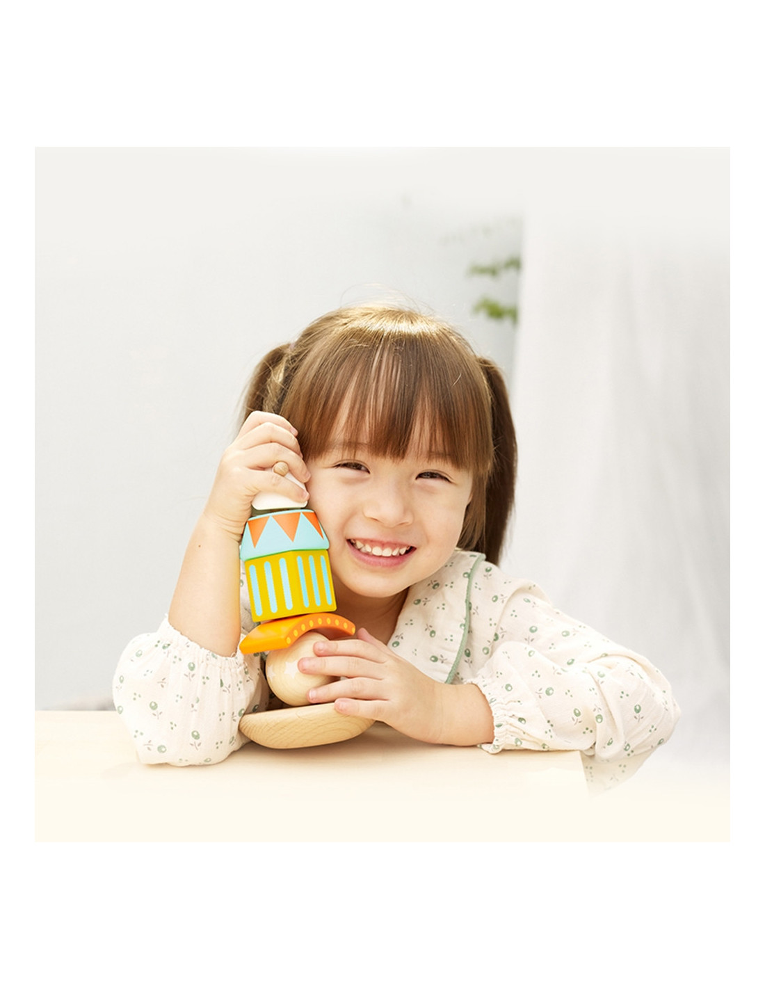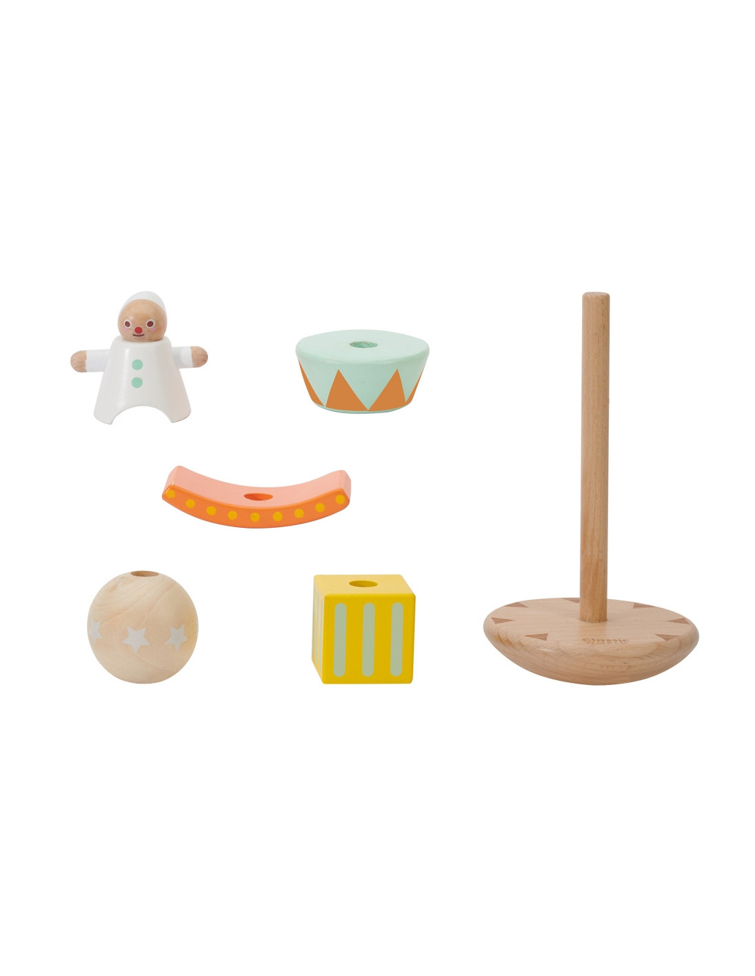 - - Zestaw zawiera cztery kolorowe drewniane elementy, stojak z palikiem do układania klocków, oraz wesołego klauna.