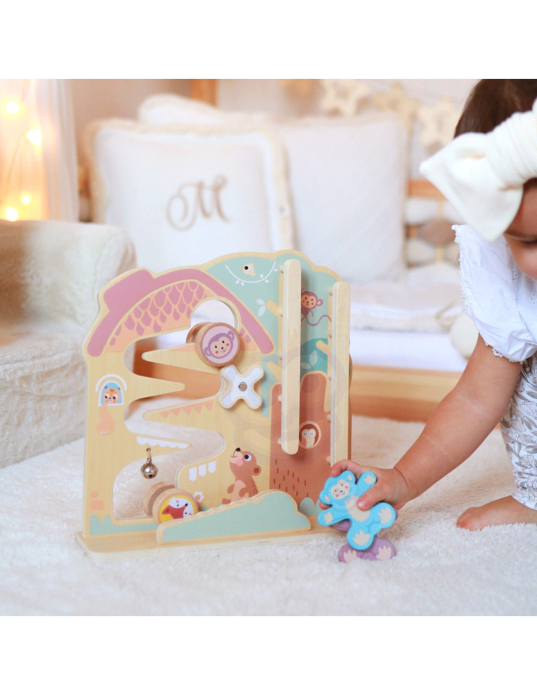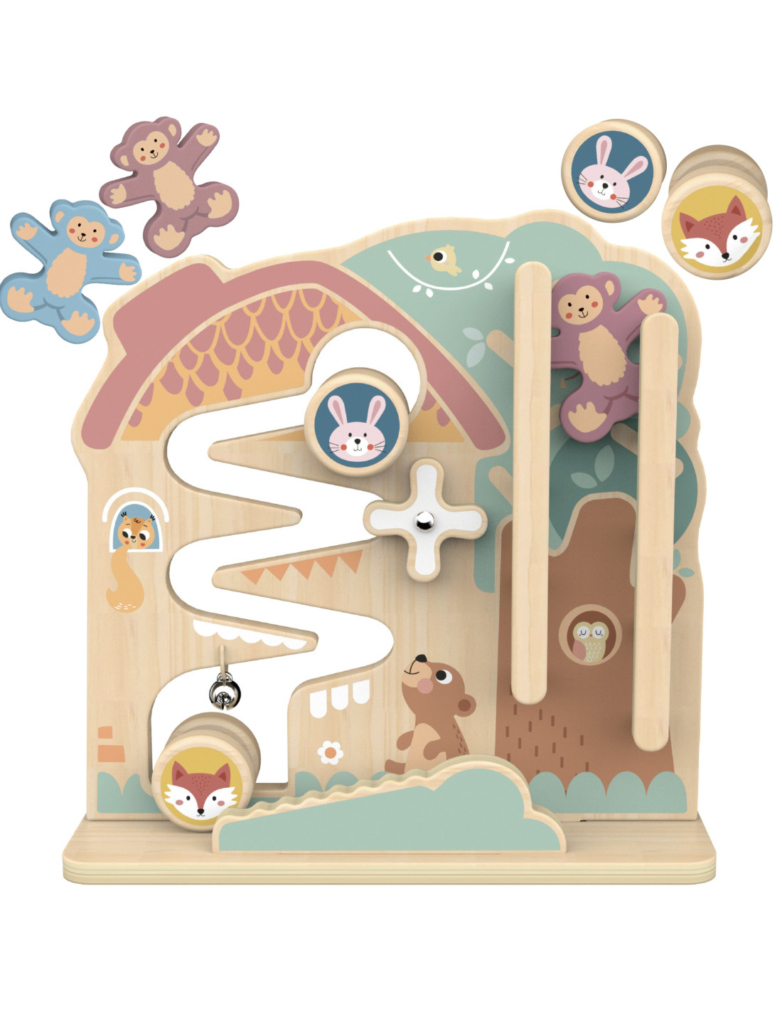 W centrum zabawy znajduje się leśny domek otoczony przyrodą, tętniący życiem małych zwierzątek. Dwie radosne, kolorowe małpki czekają na pomoc dziecka, aby zejść ze szczytu drzewa. Tymczasem Królik i Lisek przygotowali się do wyścigu, a zadaniem dziecka jest pomóc im na starcie. Zabawa kończy się miłym dźwiękiem dzwoneczka, który jednocześnie pobudza percepcję słuchową dziecka.