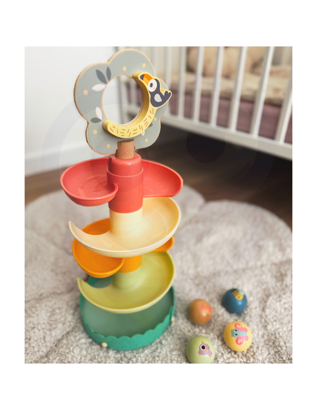 Drewniany kulodrom od marki WOOPIE GREEN to idealna zabawka sensoryczna i edukacyjna dla maluchów od 18 miesiąca życia. Spiralna wieża składająca się z 6 kolorowych, łatwych do złożenia elementów, pozwala dzieciom budować swój własny tor kulkowy. Do zestawu dołączone 4 lekkie kulki z nadrukami zwierzątek i nutek, które dzieci mogą obserwować podczas toczenia się w dół – to nie tylko frajda, ale też doskonałe ćwiczenie dla wzroku i rączek. Motyw lasu pobudza wyobraźnię i zachęca do samodzielnej zabawy, a naturalne drewno i bezpieczne materiały gwarantują jakość oraz trwałość