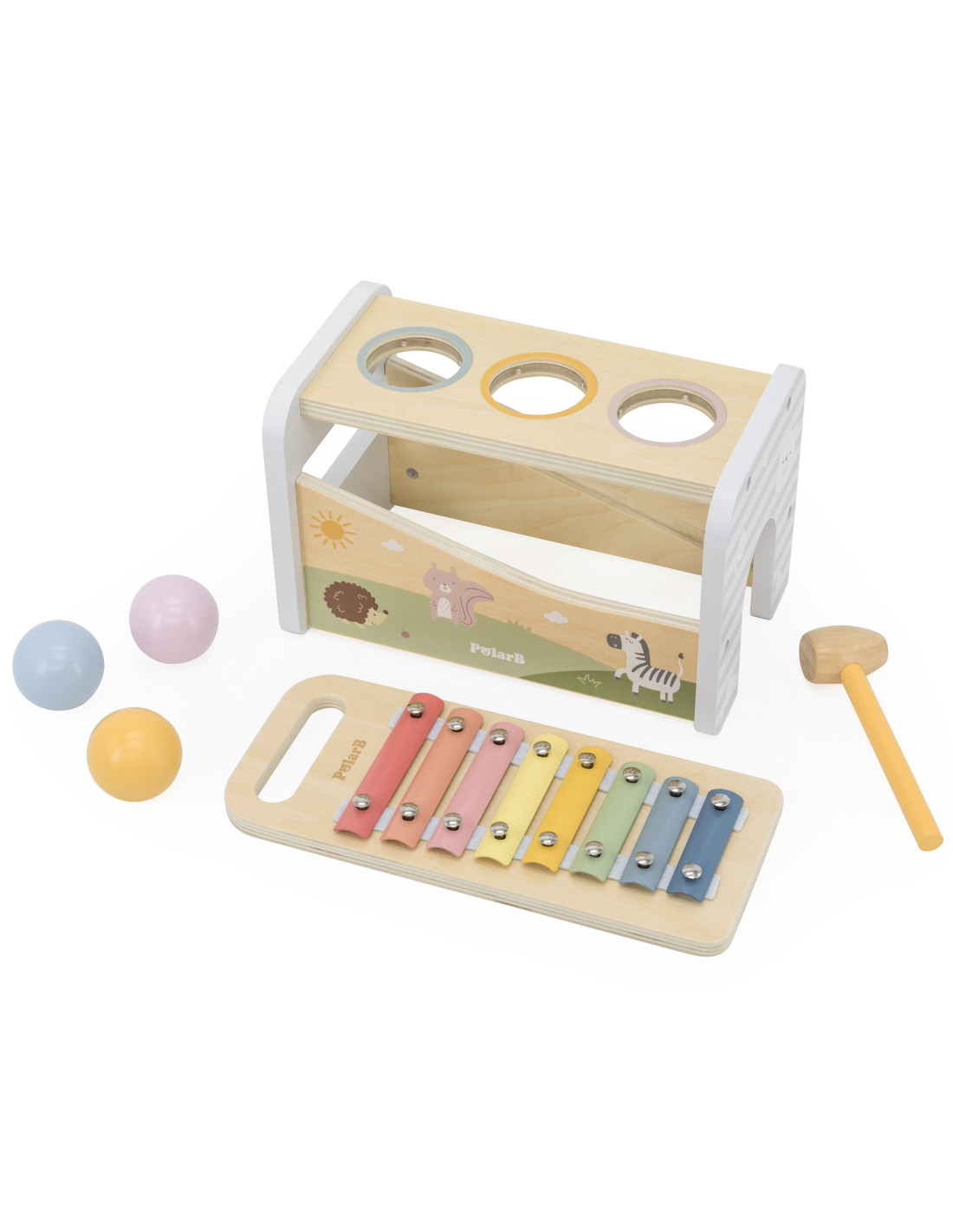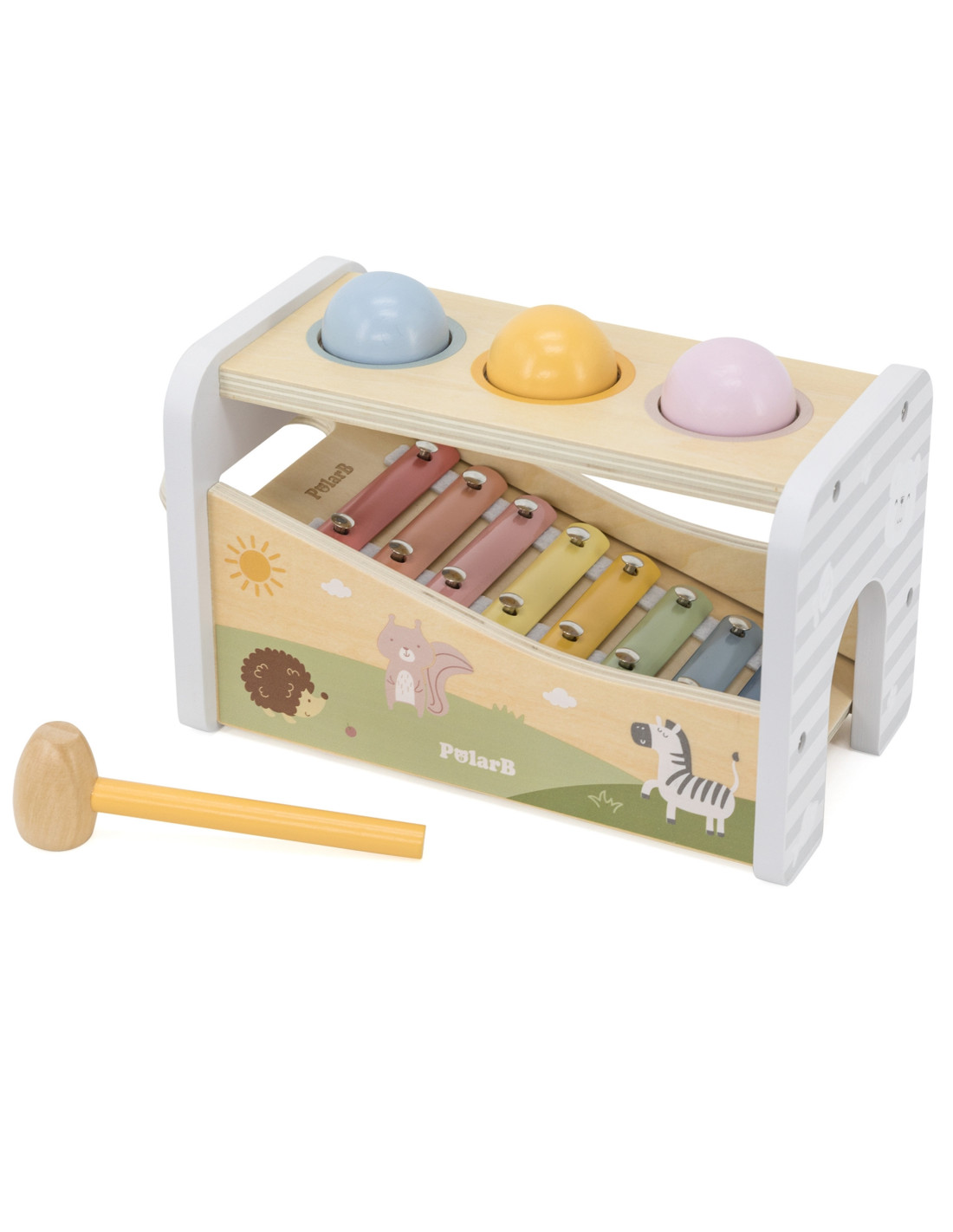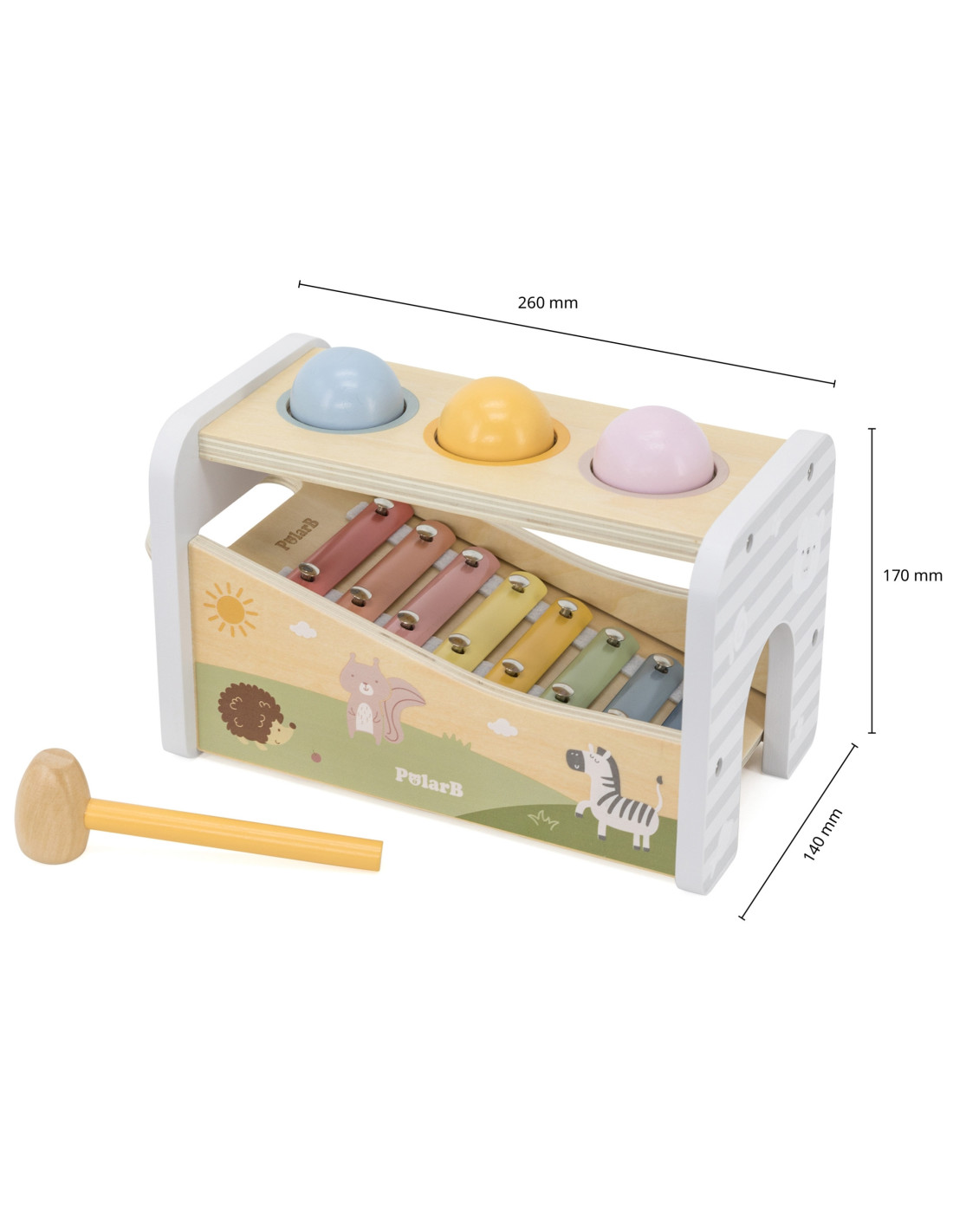 - - Dwie funkcje w jednej zabawce – Uderzaj młoteczkiem w kulki i obserwuj, jak spadają na cymbałki, wydając delikatne dźwięki. Możesz też użyć pałeczki do tworzenia własnych melodii na kolorowych klawiszach!