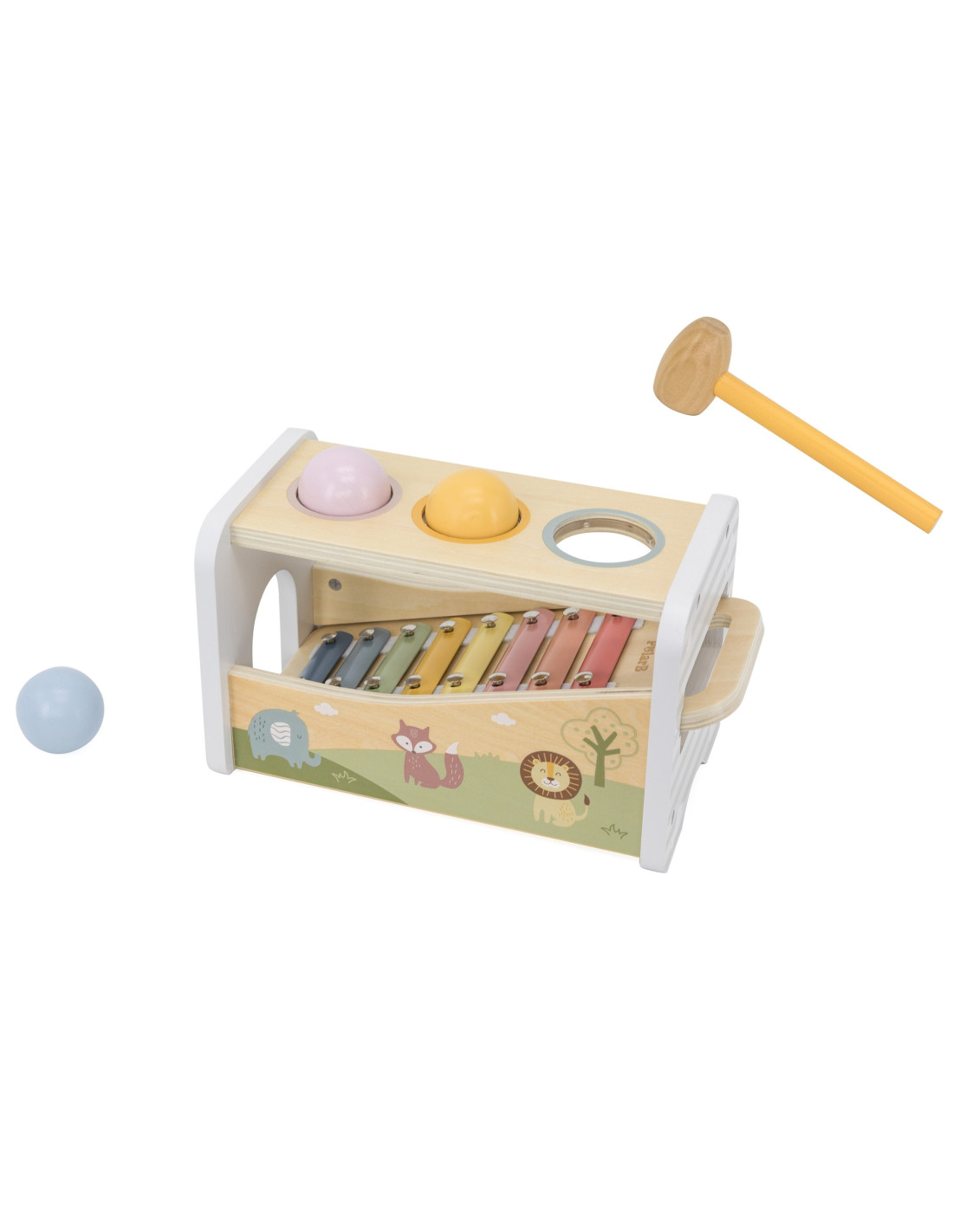VIGA Drewniana Wybijanka + Cymbałki 2w1 Pozwól swojemu dziecku odkrywać świat dźwięków i zabawy dzięki drewnianym cymbałkom i przebijance w jednym! To wyjątkowa zabawka edukacyjna, która nie tylko zapewni godziny radości, ale również wspomoże rozwój manualny, wyobraźnię i wrażliwość na dźwięki.Dziecko może bawić się na dwa sposoby: uderzając pałeczką w cymbałki, tworząc piękne melodie, lub korzystając z przebijanki – kulki spadają na cymbałki, wydając delikatne, przyjemne dla ucha dźwięki. Idealna zabawka rozwijająca zdolności manualne, koordynację ruchową oraz zmysł słuchu. Doskonała dla małych artystów, którzy uwielbiają łączyć zabawę z nauką!